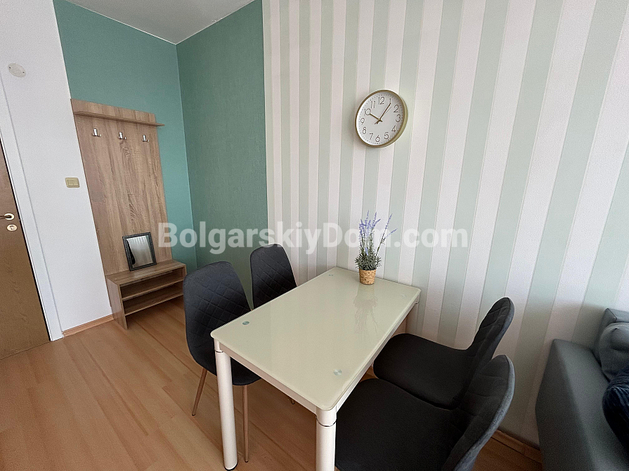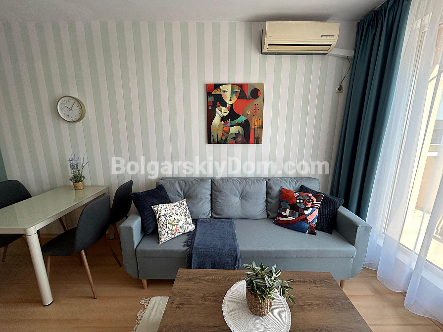 Moderne Zwei-Zimmer-Wohnung im Komplex “Sunny Day 6”, Sonnenstrand Zum Verkauf steht eine gemütliche und stilvoll eingerichtete Wohnung mit 54 m², gelegen im 4. Stock (ohne Aufzug) des beliebten Komplexes “Sunny Day 6”. Der Komplex befindet sich nur 4 km vom Strand und dem Zentrum des Ferienortes Sonnenstrand entfernt. Die Gegend bietet eine gut ausgebaute Infrastruktur und bequeme Verkehrsanbindungen, was das Wohnen hier besonders angenehm macht. Die Wohnung besteht aus einem geräumigen Wohnzimmer mit Küchenbereich, einem separaten Schlafzimmer, einem Badezimmer und einem Balkon. Sie ist voll möbliert und mit Haushaltsgeräten ausgestattet, sofort bezugsfertig oder zur Vermietung geeignet.