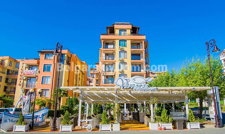 Victorio 3 befindet sich in einer prestigeträchtigen Lage von Sveti Vlas, nur 200 Meter vom Strand entfernt, zwischen Yurta und dem Yachthafen Dinevi. Die Anlage bietet ein gepflegtes Gelände mit Pool, Parkplatz und Sicherheitsdienst, und die Wartungsgebühr von 10 EUR pro qm pro Jahr sorgt für Ordnung und liegt niedrig im Vergleich zu benachbarten Wohnanlagen. Die lebhafte Promenade mit Bars und Geschäften ist in 5 Minuten zu Fuß erreichbar.