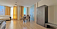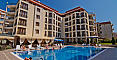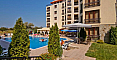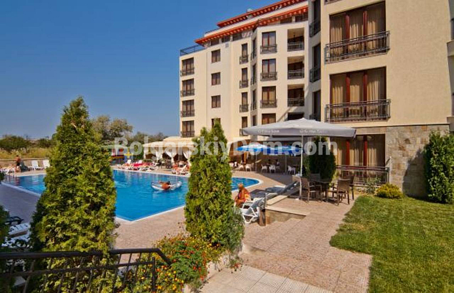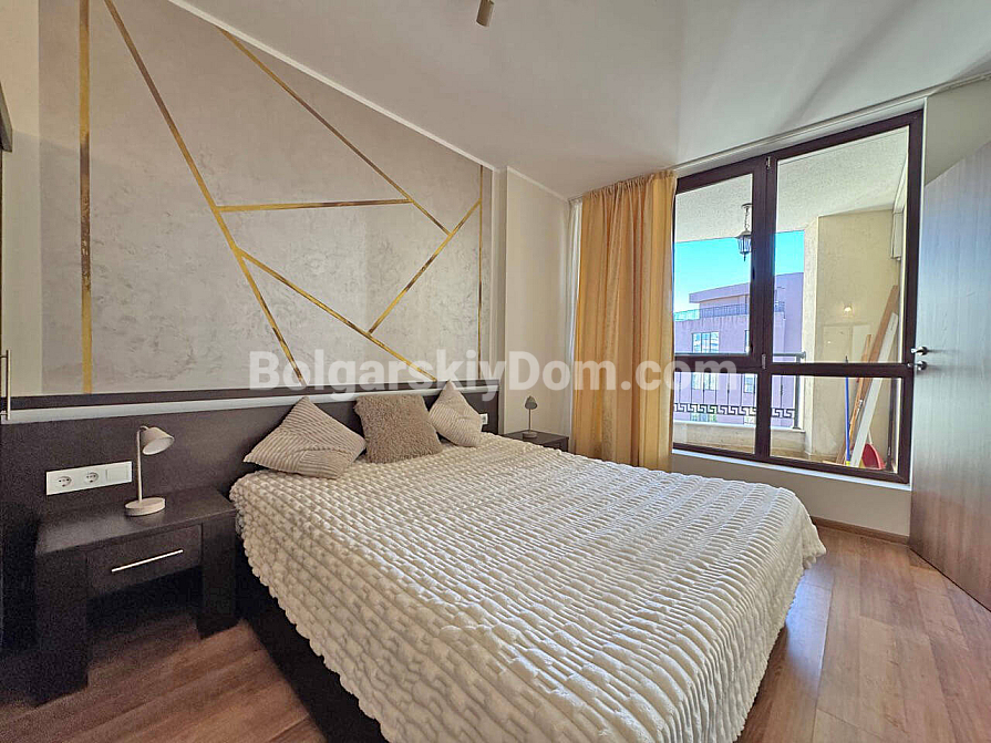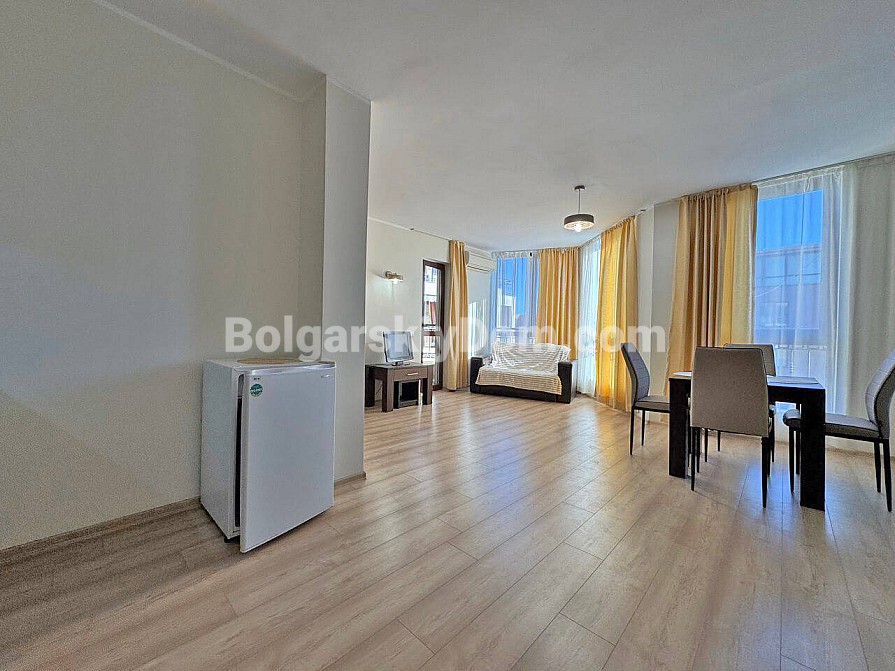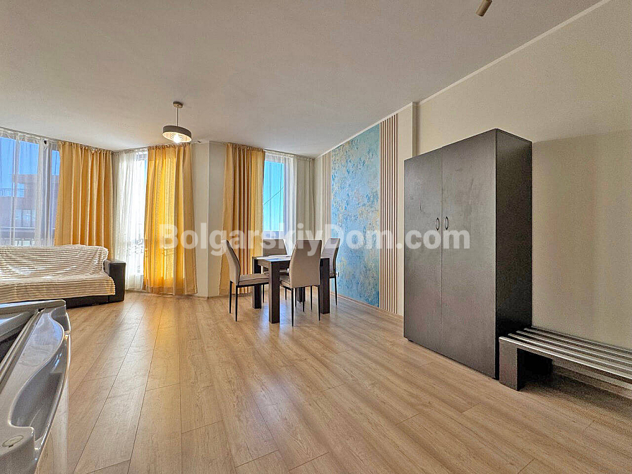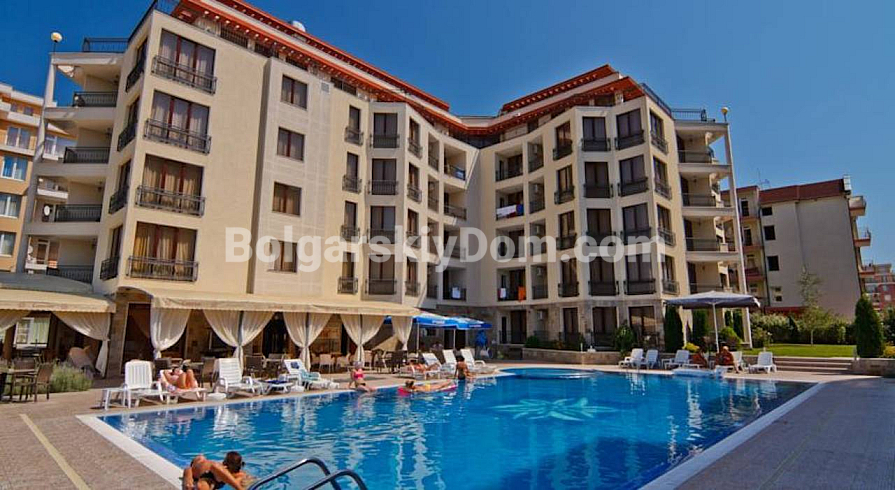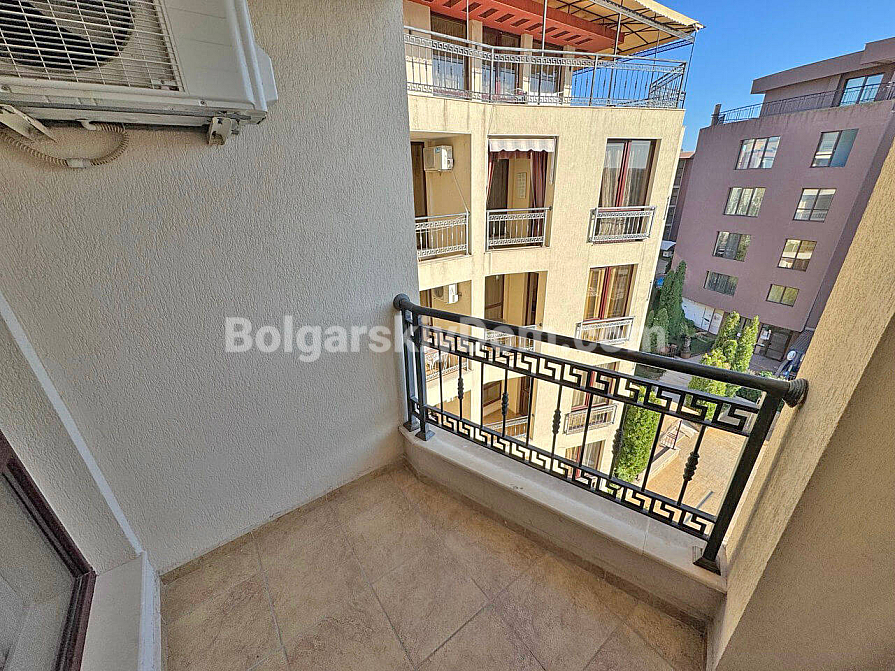Die Wohnanlage Camelot Residence, in der sich die Wohnung befindet, ist im modernen mediterranen Stil mit bulgarischen Akzenten erbaut. Die freundlich gefärbten Fassaden, großzügigen Balkone und Panoramafenster schaffen ein Gefühl von Freiheit und Naturnähe. Auf dem gepflegten Gelände gibt es gepflegte Alleen, einen Erholungsbereich, ein Schwimmbad mit Sonnenliegen, einen Kinderspielplatz, ein Restaurant und Parkplätze. All dies macht sie zu einem idealen Ort zum Leben, und das Meer ist nur 700 Meter entfernt. Die jährliche Wartungsgebühr beträgt 10 Euro pro Quadratmeter.
