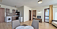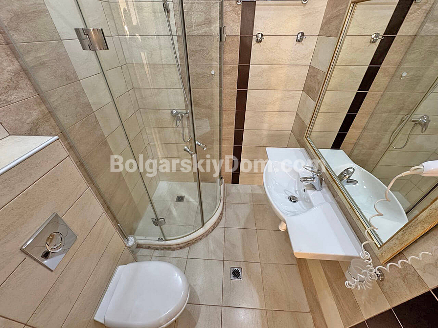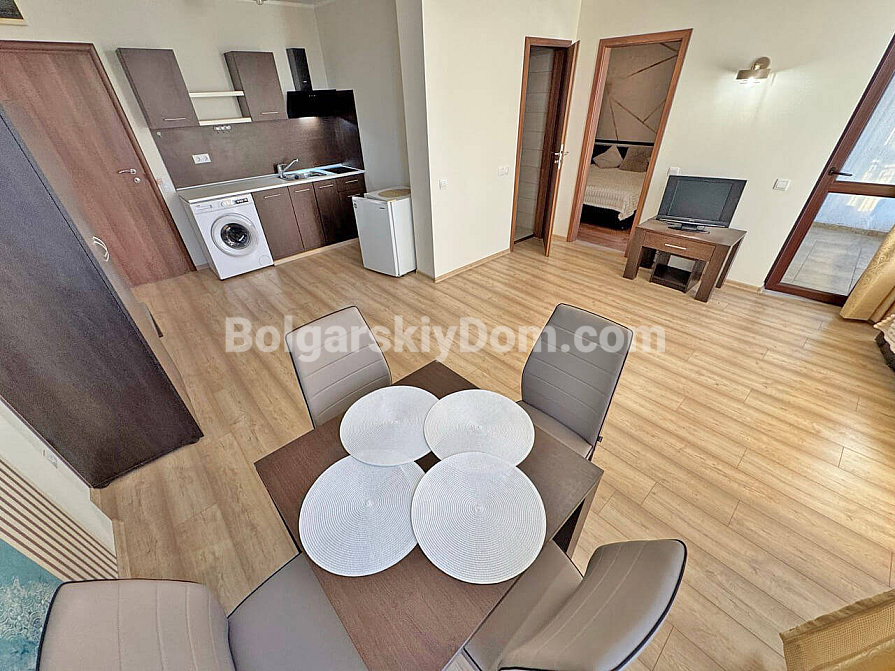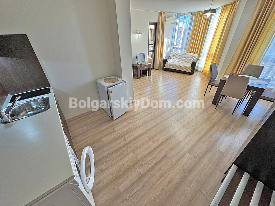Im Herzen des größten bulgarischen Ferienortes, in einem ruhigen und grünen Teil von Sonnenstrand, bieten wir eine geräumige Zwei-Zimmer-Wohnung an, die bereits schlüsselfertig und in hoher Qualität ausgestattet ist. Dieses helle und großzügige Apartment mit 60 qm befindet sich im fünften Stock und verfügt über einen privaten Balkon. Der Grundriss umfasst einen Flur, ein Wohnzimmer mit durchdachter Raumaufteilung, ein Schlafzimmer, ein Badezimmer und eine Terrasse. Die kompakte Küche fügt sich harmonisch in den Raum ein, was die Wohnung sehr wohnlich und praktisch macht.
