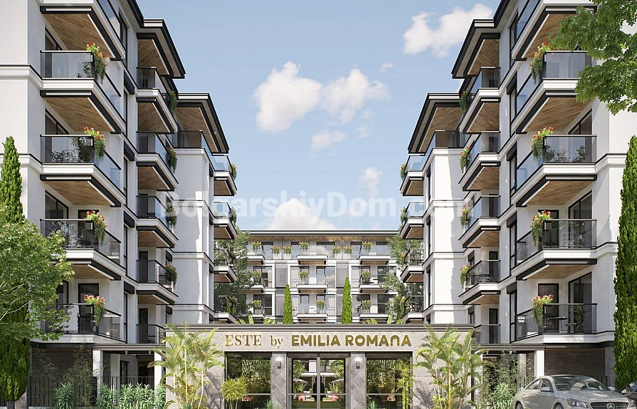 Der Komplex Emilia Romana Este ist Teil eines großangelegten Wohnprojekts, das sich in einer ruhigen und grünen Gegend von Sonnenstrand befindet, nur 1 km vom Meer entfernt. Auf dem weitläufigen Gelände wird es ein ganzjährig geöffnetes Fitnesscenter mit Spa-Bereich, mehrere Themenpools, Restaurants, gepflegte Gärten und Kinderspielplätze geben. Rund-um-die-Uhr-Sicherheitsdienst, Videoüberwachung und Tiefgarage sind selbstverständliche, aber für Investoren wichtige Aspekte. Die jährliche Wartungsgebühr beträgt 16 Euro pro Quadratmeter.