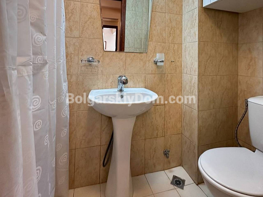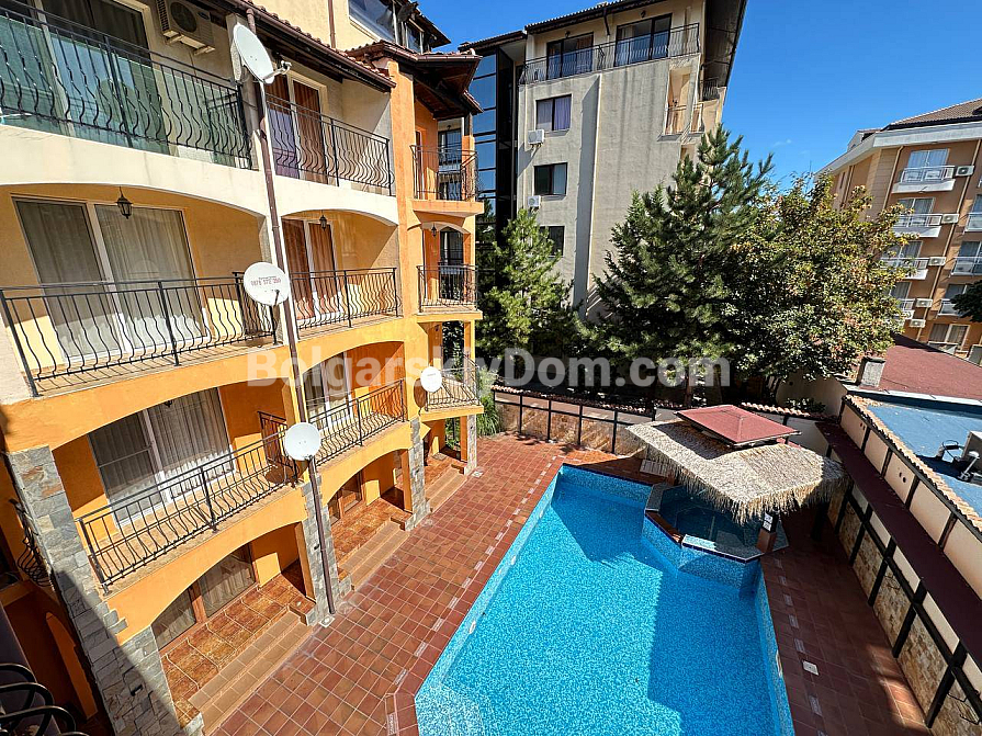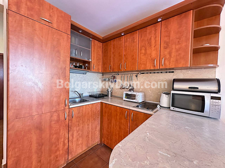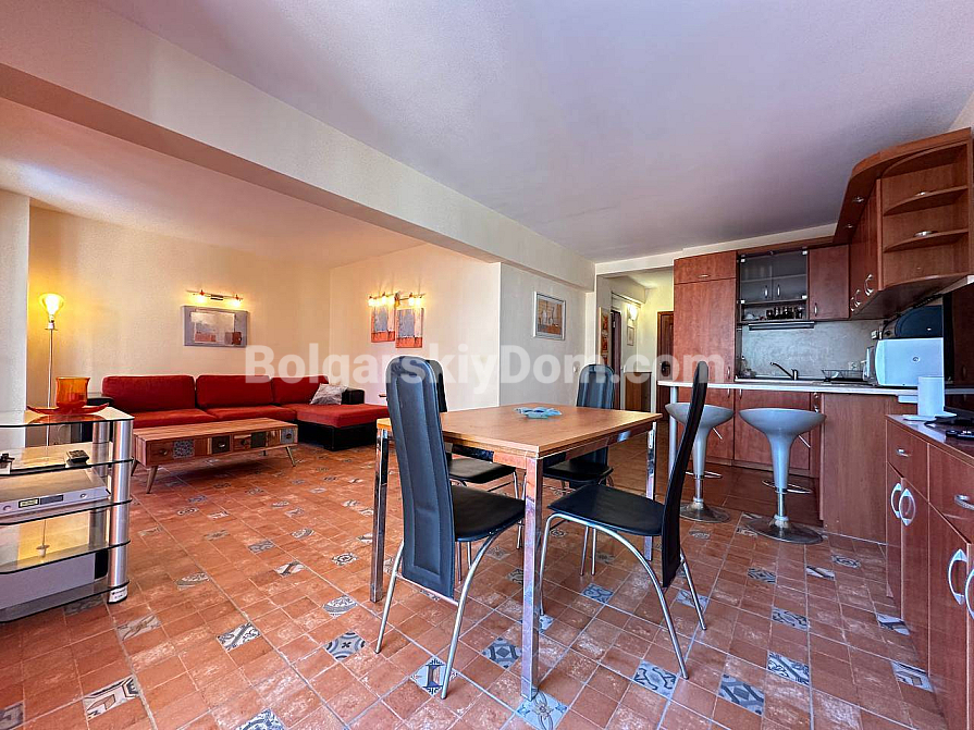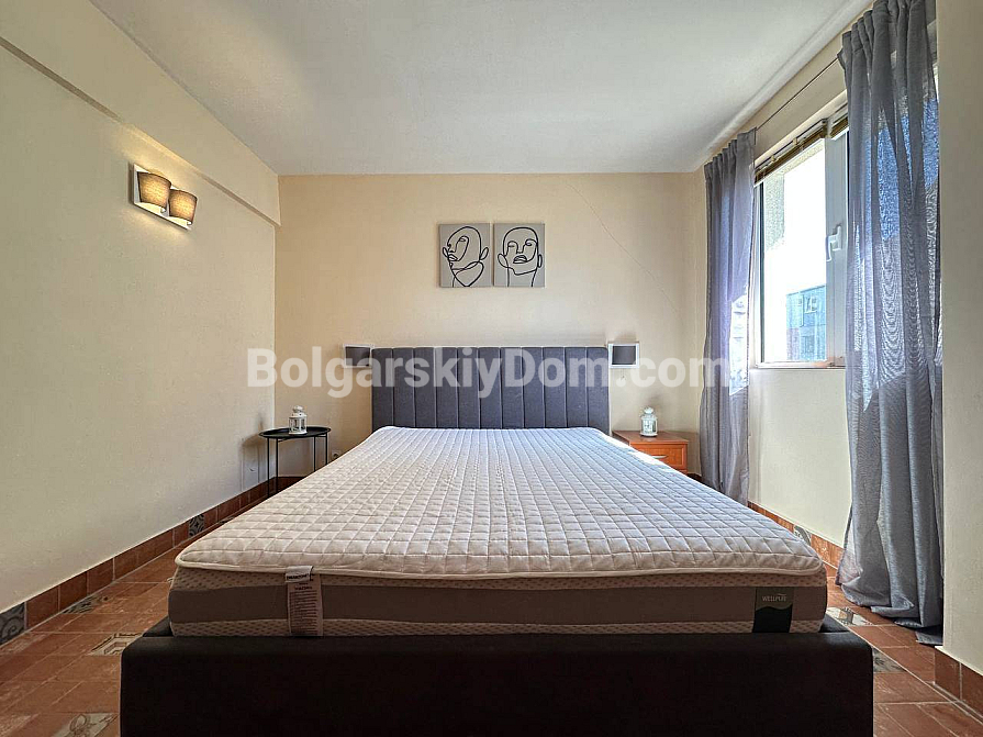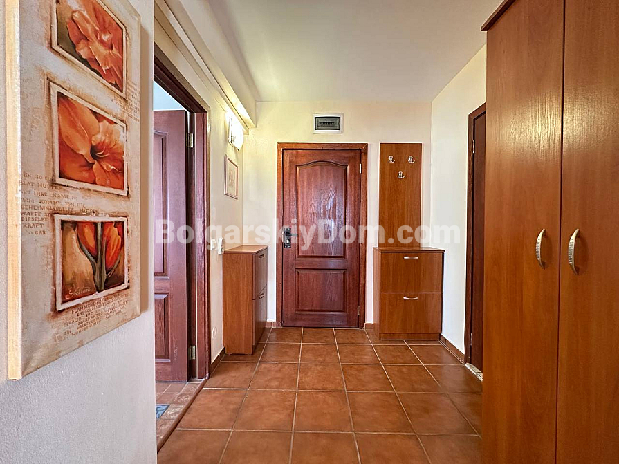 Der Katalog von Bolgarskiy Dom wurde um ein neues Vorschlag am Sonnenstrand bereichert. Diese Zwei-Zimmer-Wohnung ist ideal für einen ruhigen und komfortablen Aufenthalt am Meer eingerichtet. Mit einer Fläche von 88 qm befindet sie sich im dritten Stock eines Gebäudes mit Aufzug und zeichnet sich durch einen originellen und durchdachten Grundriss aus: ein gemütlicher Eingangsbereich, ein Gäste-WC, ein geräumiges Wohnzimmer mit Küchenbereich und Entspannungszone, ein großes Schlafzimmer mit eigenem Bad und begehbarer Garderobe sowie ein breiter Balkon mit Blick auf den grünen Innenhof und den Pool.
