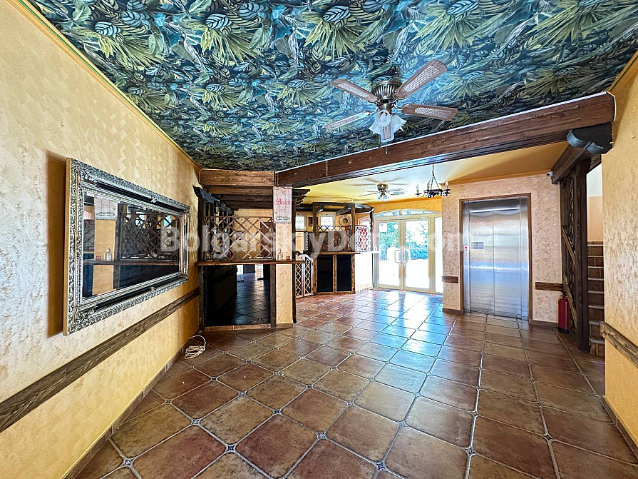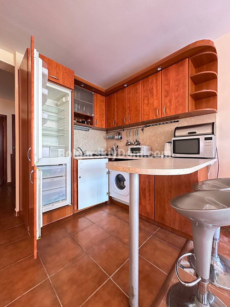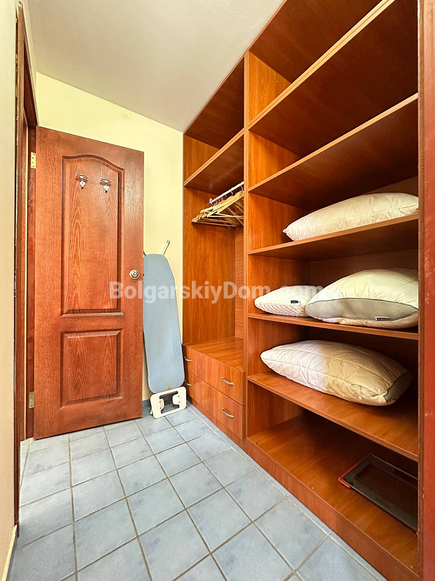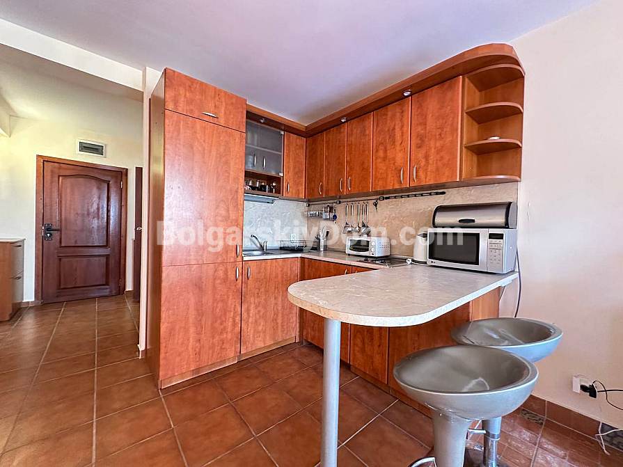 Der Katalog von Bolgarskiy Dom wurde um ein neues Vorschlag am Sonnenstrand bereichert. Diese Zwei-Zimmer-Wohnung ist ideal für einen ruhigen und komfortablen Aufenthalt am Meer eingerichtet. Mit einer Fläche von 88 qm befindet sie sich im dritten Stock eines Gebäudes mit Aufzug und zeichnet sich durch einen originellen und durchdachten Grundriss aus: ein gemütlicher Eingangsbereich, ein Gäste-WC, ein geräumiges Wohnzimmer mit Küchenbereich und Entspannungszone, ein großes Schlafzimmer mit eigenem Bad und begehbarer Garderobe sowie ein breiter Balkon mit Blick auf den grünen Innenhof und den Pool.