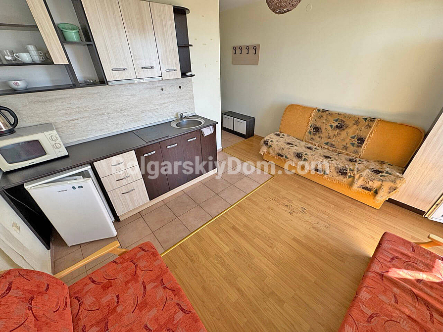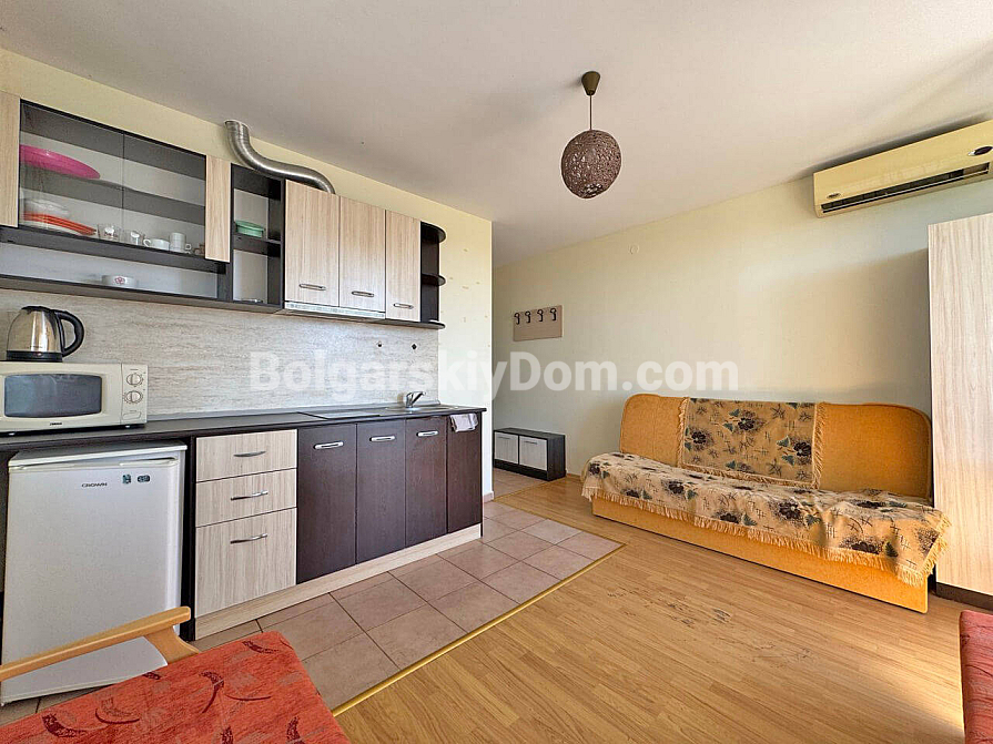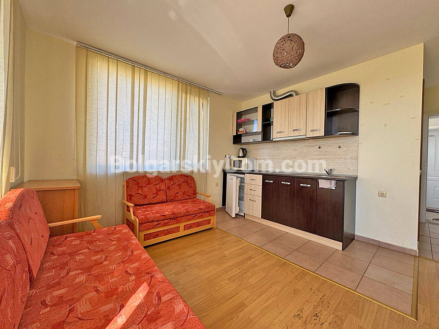 Im westlichen Teil von Sonnenstrand ist ein interessantes Angebot erschienen – ein helles Studioapartment mit einer Fläche von 42 qm. Es befindet sich im 4. Stock eines der Gebäude einer großen, schönen Anlage aus der Grand Resort-Familie. Es handelt sich um einen geräumigen Raum mit zwei Sofas, Klimaanlage und kompakter Küche; es gibt ein modernes Badezimmer mit Duschkabine, Waschmaschine und Boiler sowie einen großzügigen Balkon mit schönem Blick auf die Grünanlagen und das Gelände. Zwei große Fenster im Apartment sorgen für viel Licht, was es besonders gemütlich und komfortabel macht.