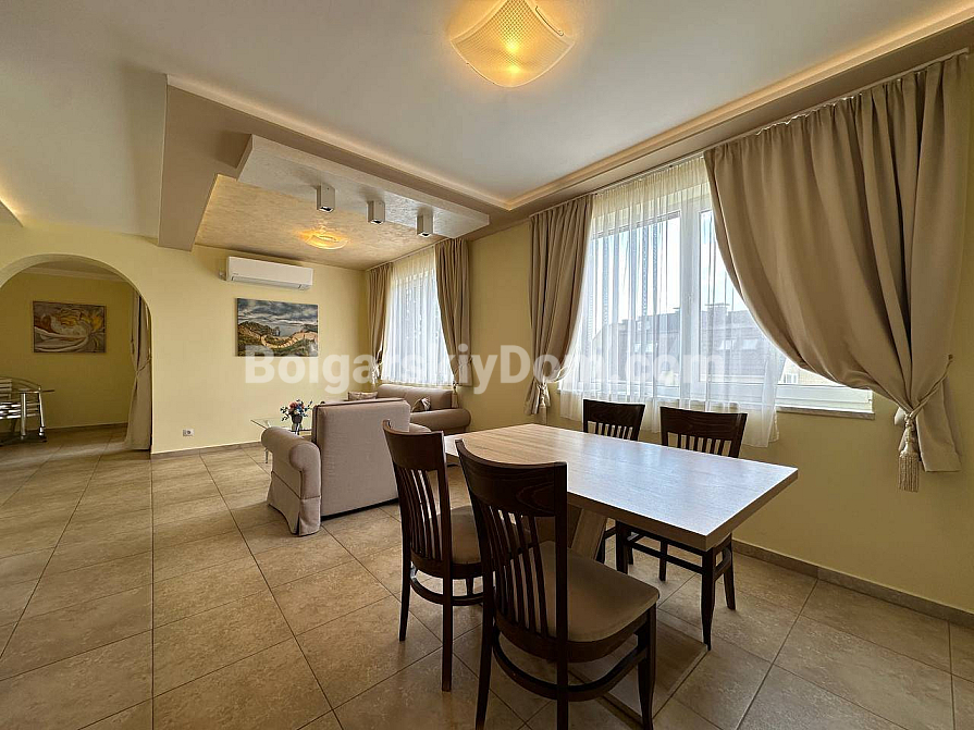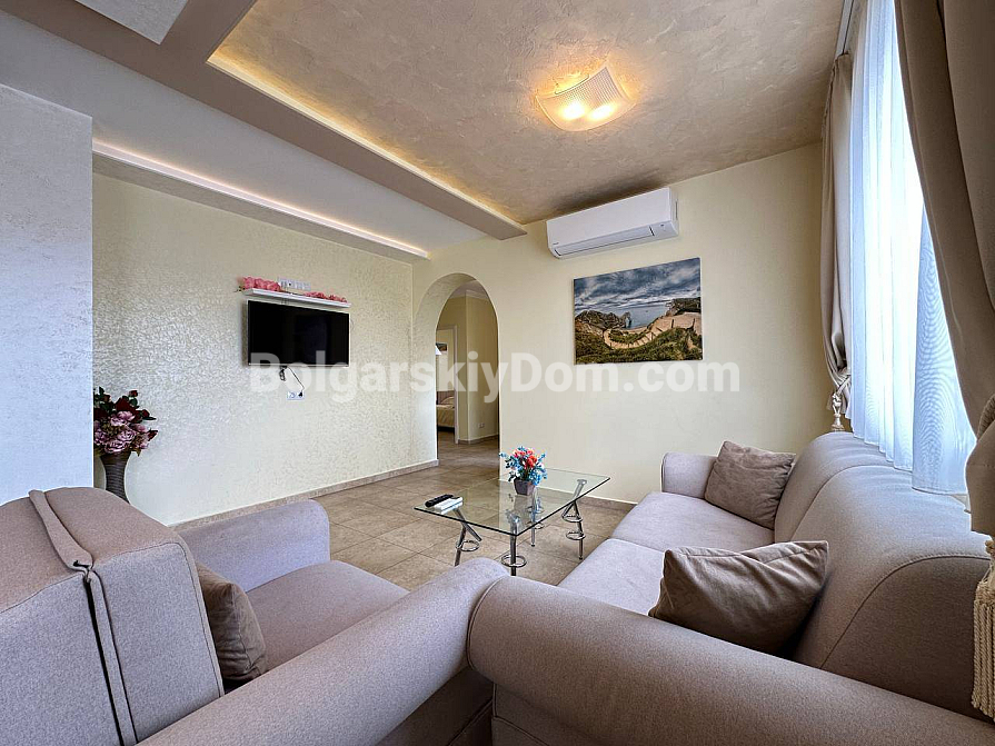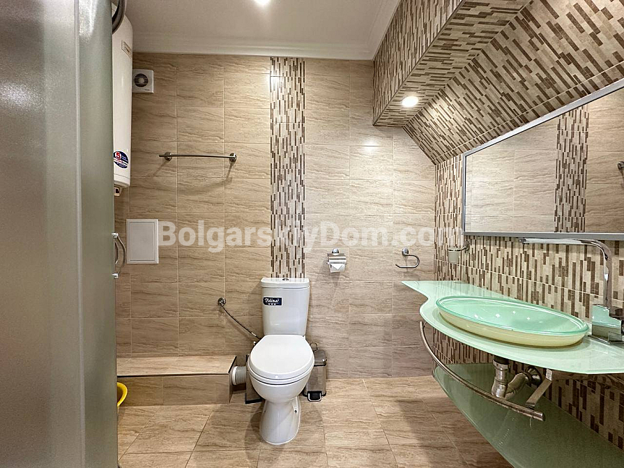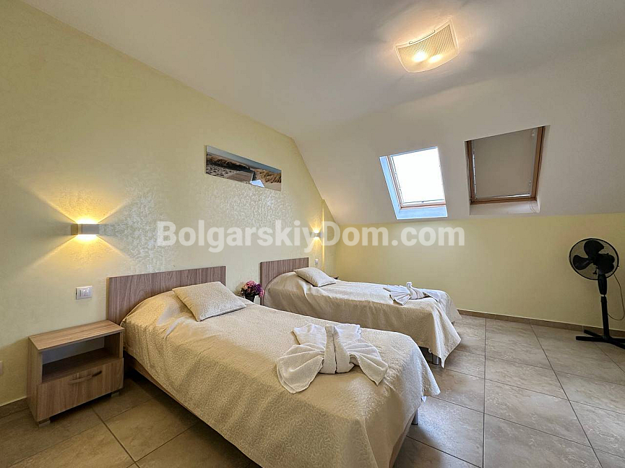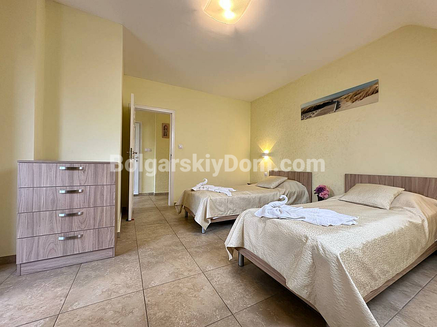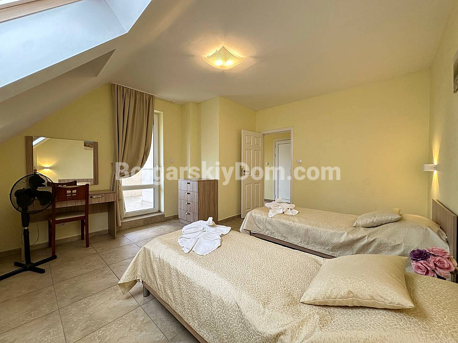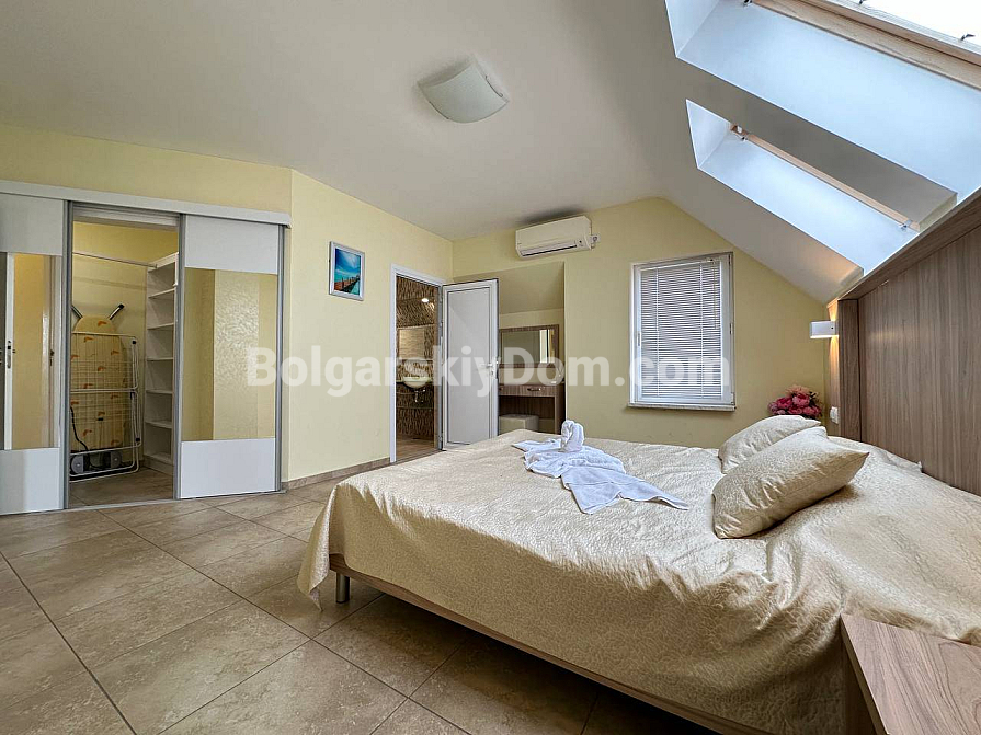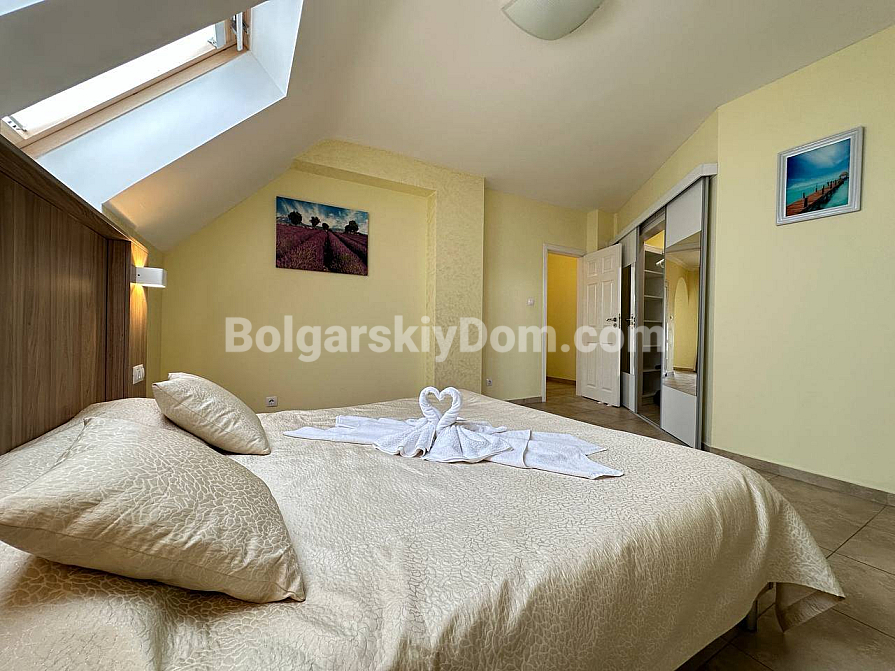 Wenn Sie nach maximalem Raum und einem bis ins Detail durchdachten Design suchen, hat die Firma Bolgarskiy Dom das perfekte Angebot für Sie. Im obersten, sechsten Stock des Komplexes Sea Dreams steht eine luxuriöse Dreizimmerwohnung mit einer Fläche von 127 m² zum Verkauf! Das Interieur ist in hellen Pastelltönen gehalten und schafft eine äußerst angenehme und gemütliche Atmosphäre. Im geräumigen Wohnzimmer befinden sich ein großes Sofa, ein Fernseher und stilvolle Dekorationen. Die moderne Küche mit Holzfronten ist mit allen Großgeräten ausgestattet: Kühlschrank, Backofen, Mikrowelle und sogar Waschmaschine. Im Hauptschlafzimmer gibt es Dachfenster und ein großes Bett, im zweiten Schlafzimmer zwei Einzelbetten. Die gesamte Wohnung ist klimatisiert und bezugsfertig.