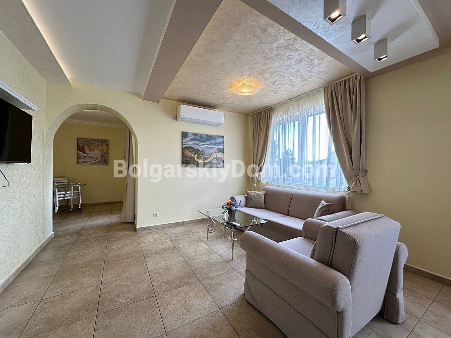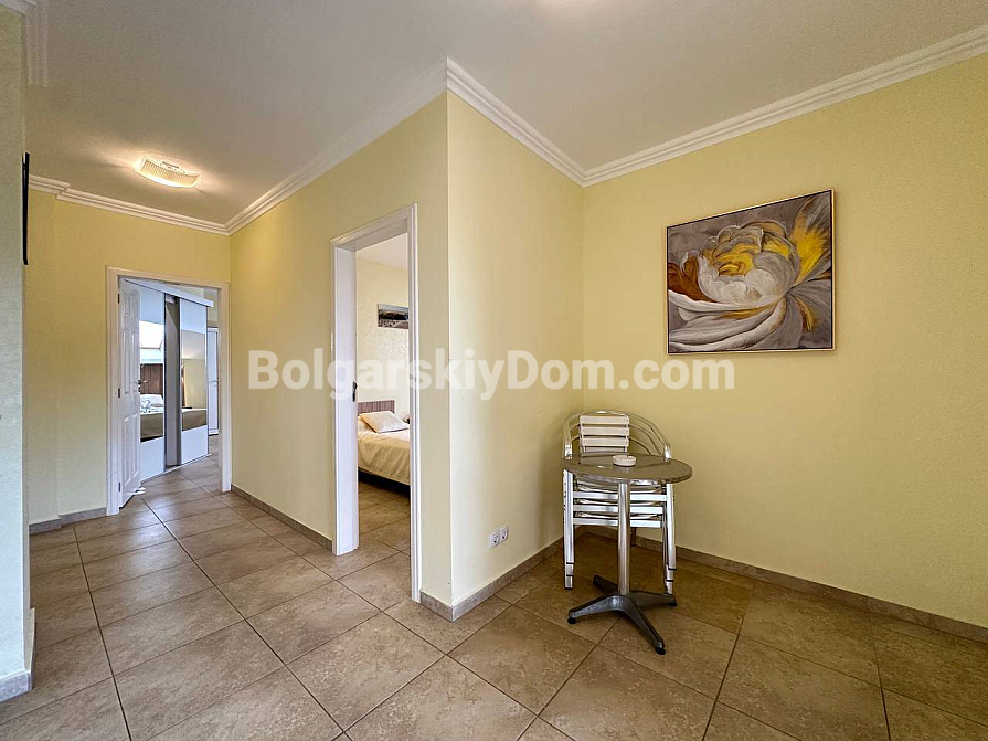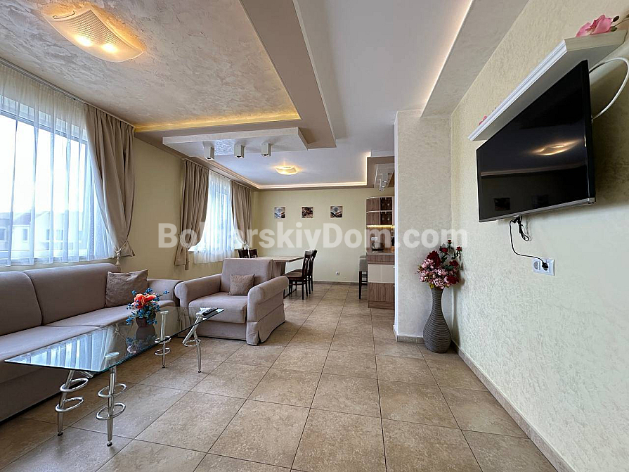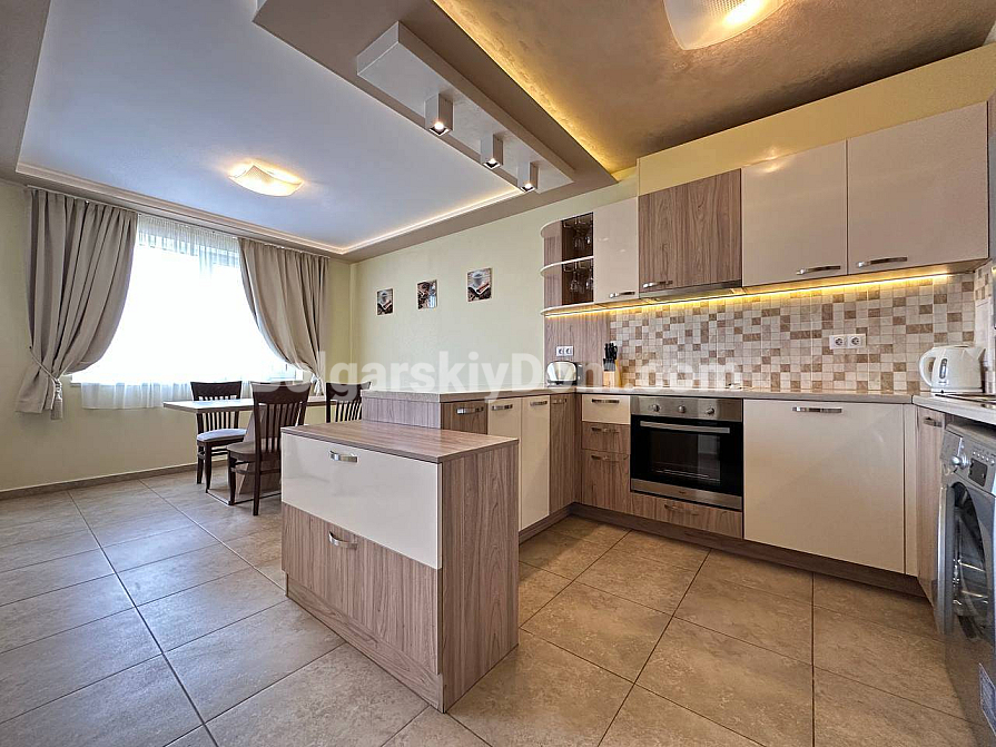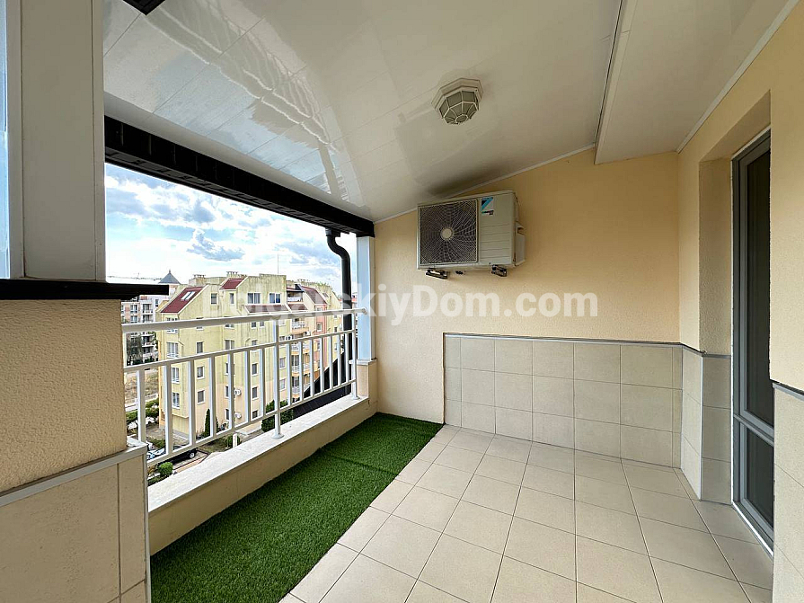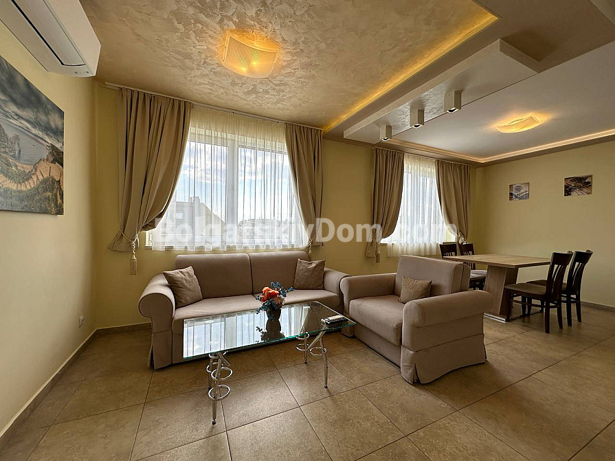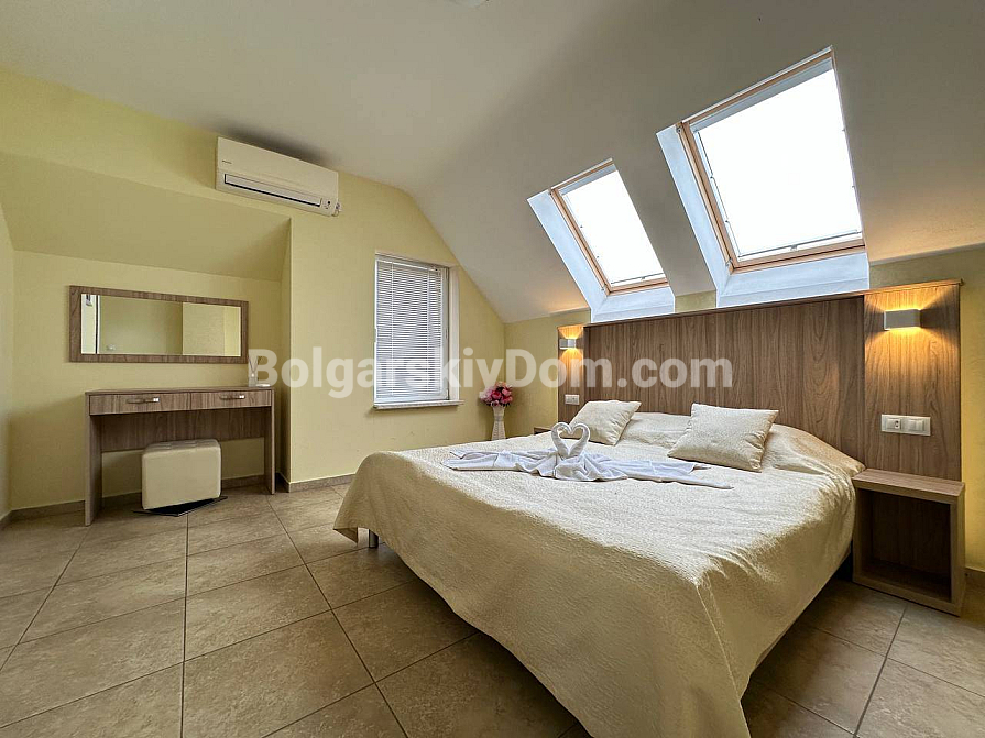 Wenn Sie nach maximalem Raum und einem bis ins Detail durchdachten Design suchen, hat die Firma Bolgarskiy Dom das perfekte Angebot für Sie. Im obersten, sechsten Stock des Komplexes Sea Dreams steht eine luxuriöse Dreizimmerwohnung mit einer Fläche von 127 m² zum Verkauf! Das Interieur ist in hellen Pastelltönen gehalten und schafft eine äußerst angenehme und gemütliche Atmosphäre. Im geräumigen Wohnzimmer befinden sich ein großes Sofa, ein Fernseher und stilvolle Dekorationen. Die moderne Küche mit Holzfronten ist mit allen Großgeräten ausgestattet: Kühlschrank, Backofen, Mikrowelle und sogar Waschmaschine. Im Hauptschlafzimmer gibt es Dachfenster und ein großes Bett, im zweiten Schlafzimmer zwei Einzelbetten. Die gesamte Wohnung ist klimatisiert und bezugsfertig.
