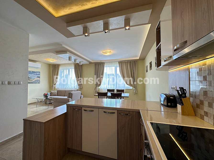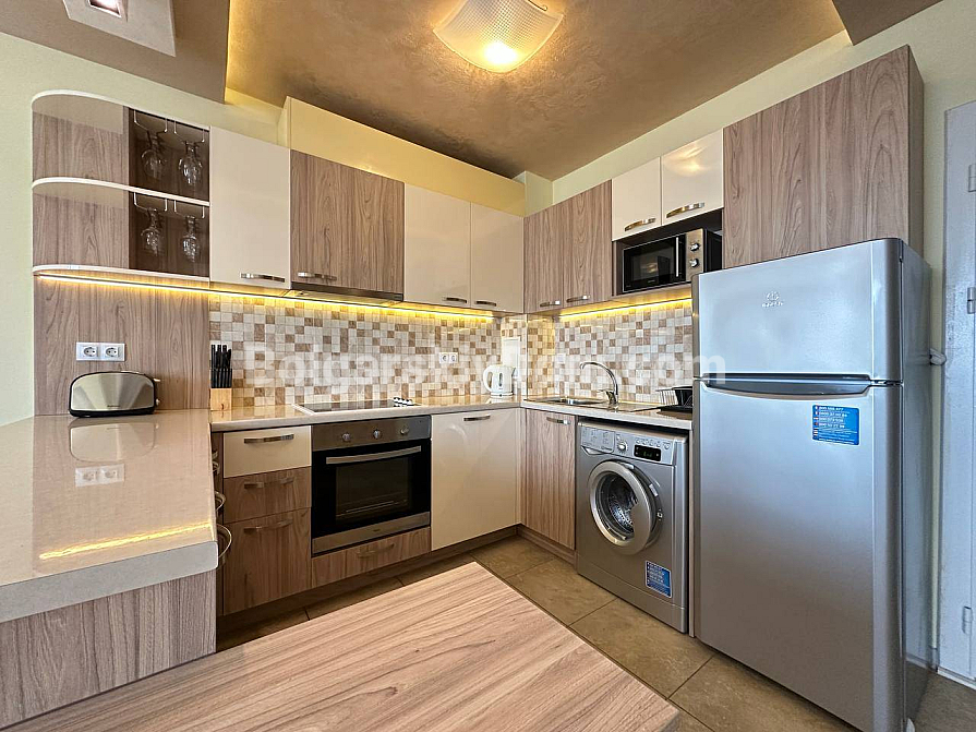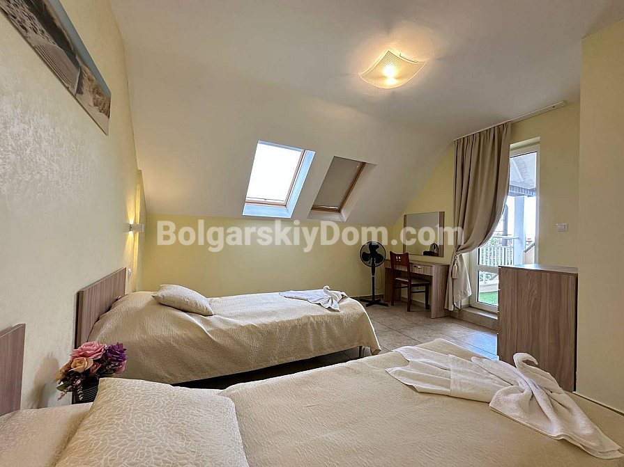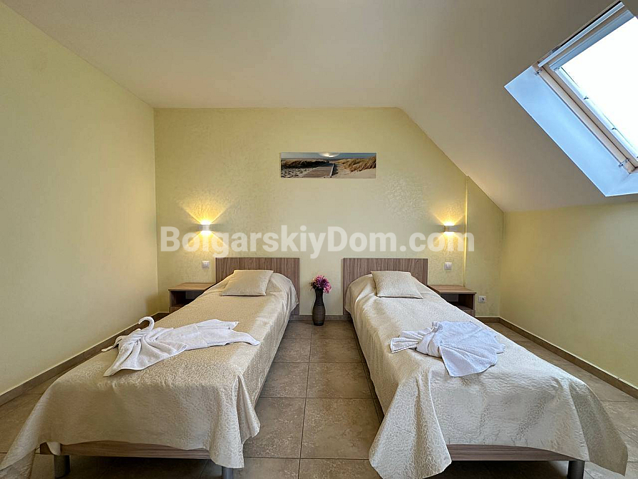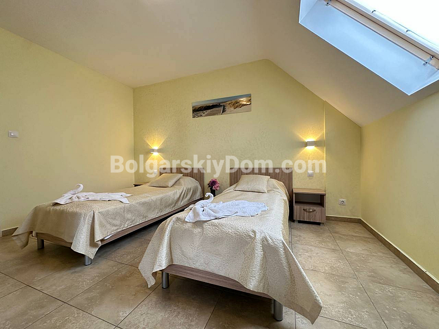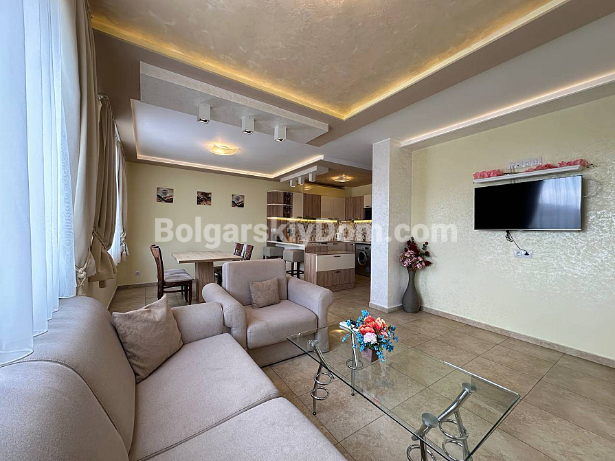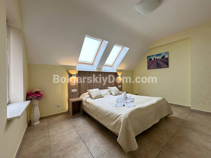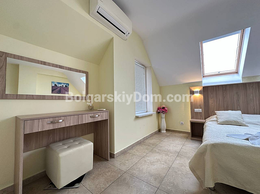 Wenn Sie nach maximalem Raum und einem bis ins Detail durchdachten Design suchen, hat die Firma Bolgarskiy Dom das perfekte Angebot für Sie. Im obersten, sechsten Stock des Komplexes Sea Dreams steht eine luxuriöse Dreizimmerwohnung mit einer Fläche von 127 m² zum Verkauf! Das Interieur ist in hellen Pastelltönen gehalten und schafft eine äußerst angenehme und gemütliche Atmosphäre. Im geräumigen Wohnzimmer befinden sich ein großes Sofa, ein Fernseher und stilvolle Dekorationen. Die moderne Küche mit Holzfronten ist mit allen Großgeräten ausgestattet: Kühlschrank, Backofen, Mikrowelle und sogar Waschmaschine. Im Hauptschlafzimmer gibt es Dachfenster und ein großes Bett, im zweiten Schlafzimmer zwei Einzelbetten. Die gesamte Wohnung ist klimatisiert und bezugsfertig.