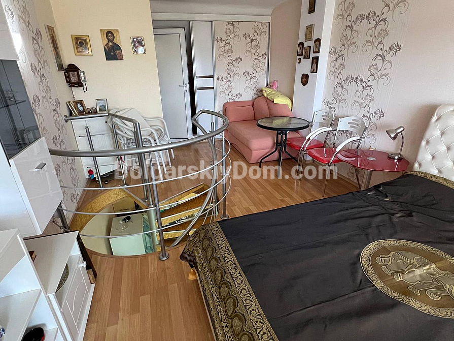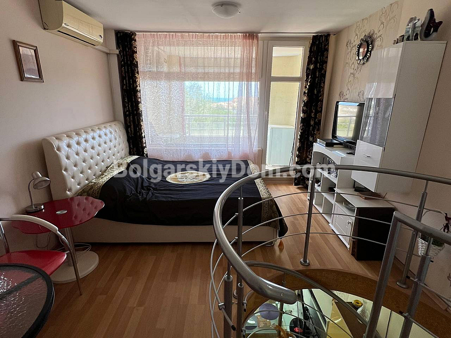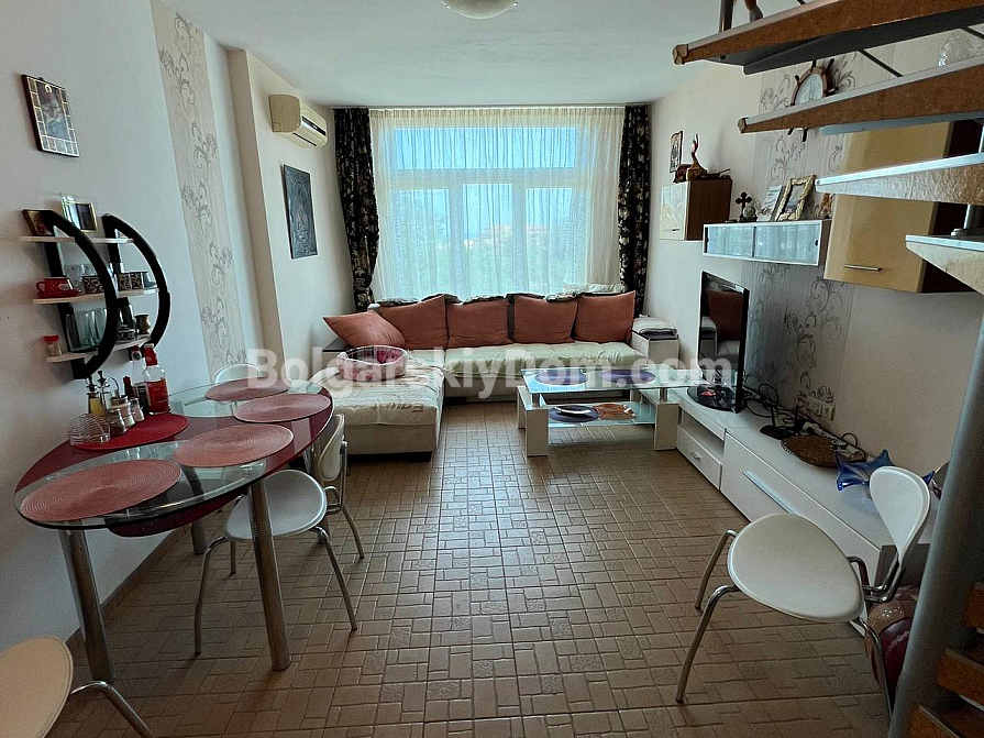 Suchen Sie eine stilvolle Wohnung mit Meerblick und durchdachtem Raumkonzept? Wir bieten zum Verkauf ein einzigartiges Maisonette-Apartment mit einem Schlafzimmer im Komplex Global Ville in Sunny Beach an. Das Apartment mit einer Fläche von 75 qm befindet sich im sechsten Stock und verfügt über eine zweistöckige Aufteilung. Im ersten Geschoss befinden sich das Wohnzimmer mit Küchenzeile, im zweiten die Schlafzimmer mit eigenem Ankleideraum und WC. Von der Terrasse der Maisonette öffnet sich ein teilweiser, aber angenehmer Meerblick. Die Wohnung wird komplett bezugsfertig mit allen Möbeln und Geräten verkauft.