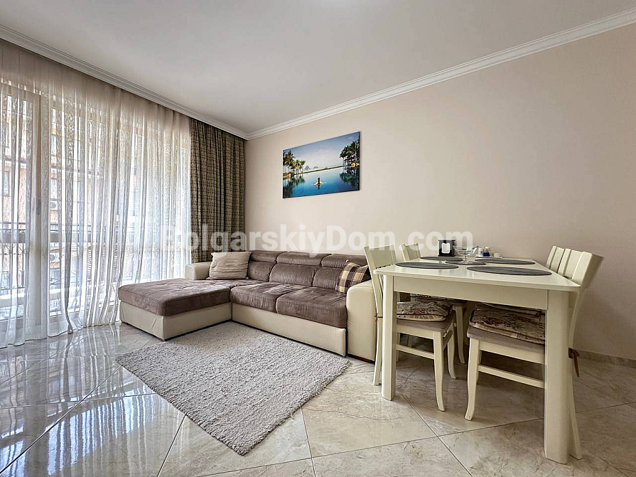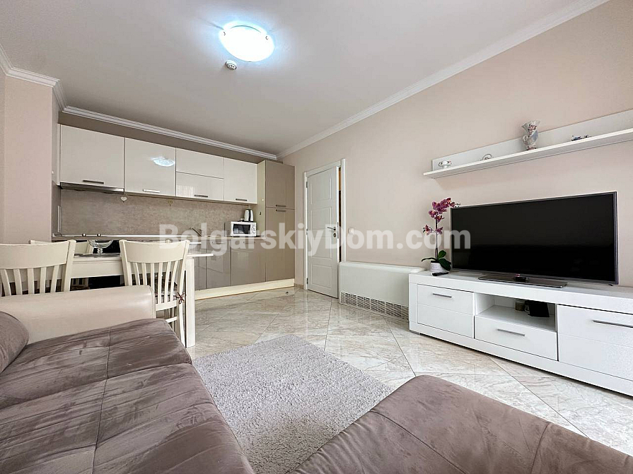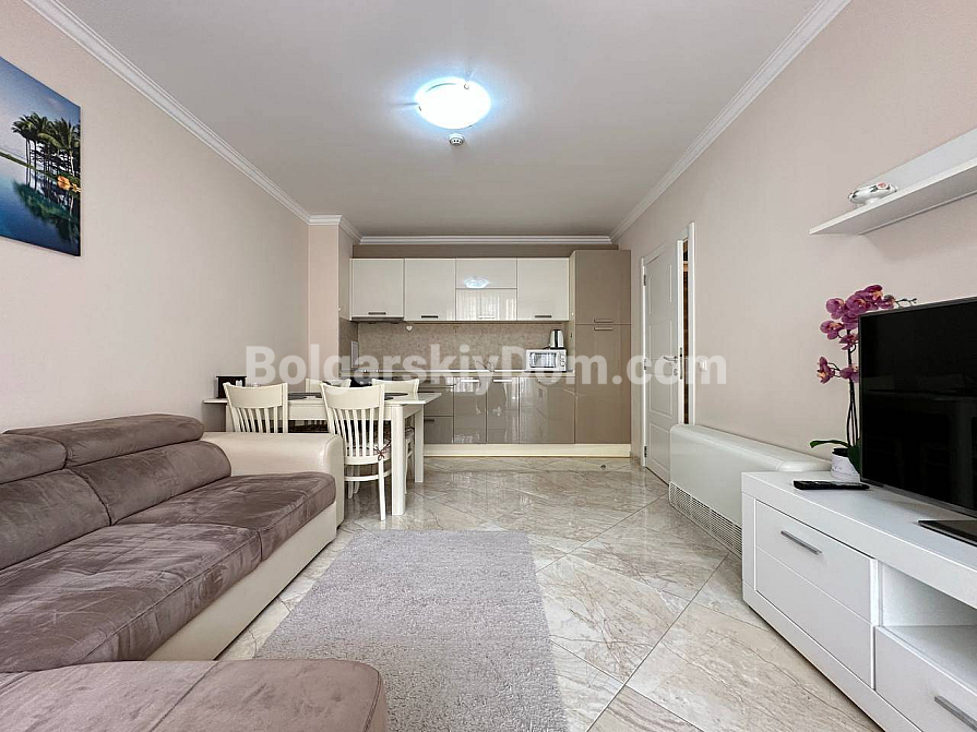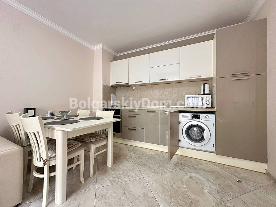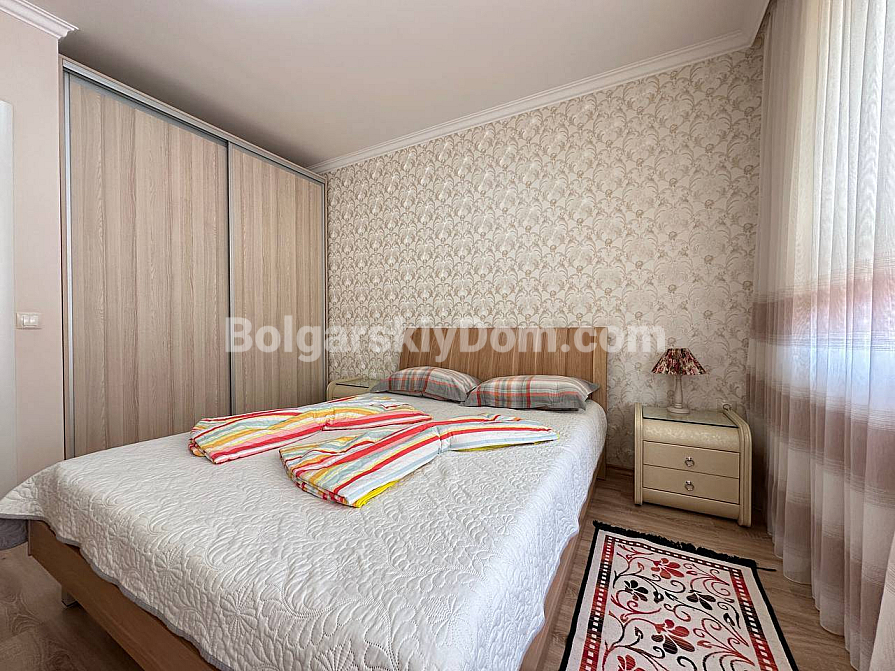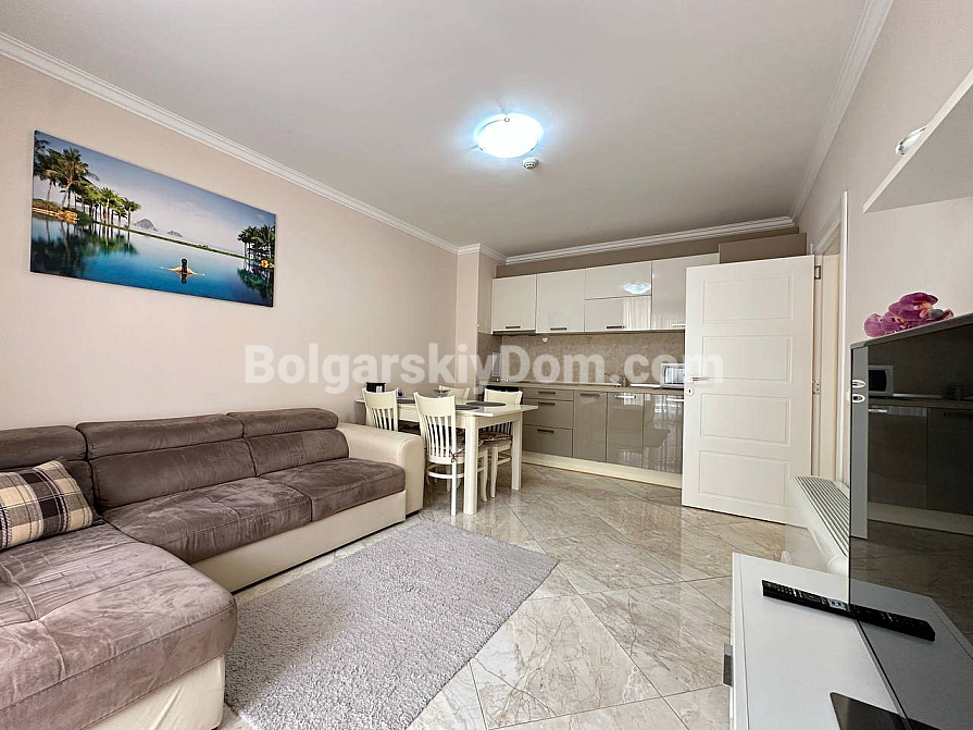 Eine moderne Zwei-Zimmer-Wohnung mit hochwertiger Renovierung und Möblierung ist bereit für Ihr komfortables Wohnen in Sveti Vlas. Die stilvolle, komplett ausgestattete Wohnung mit durchdachtem Design schafft eine Atmosphäre von Gemütlichkeit und Harmonie. Sie hat eine Fläche von 62 qm und befindet sich im zweiten Wohnstock. Das geräumige Wohnzimmer ist mit der Küche kombiniert und bildet einen einzigen funktionalen Raum für Entspannung und Geselligkeit. Die moderne Küche ist mit allen notwendigen Geräten ausgestattet: Kühlschrank, Herd, Ofen, Mikrowelle, Geschirrspüler und Waschmaschine — alles ist bereit für Ihren komfortablen Alltag. Das Schlafzimmer ist gemütlich, in hellen, entspannenden Tönen gestaltet. Ein großes Doppelbett, Einbauschrank und Kommode bieten ausreichend Stauraum, und weiche Textilien sorgen für Wärme und Gemütlichkeit. Das Badezimmer ist mit Duschkabine, Waschbecken mit Spiegel und Boiler ausgestattet — alles neu und gepflegt. Zudem gibt es eine Terrasse mit komfortablen Möbeln zur Entspannung und einem kleinen seitlichen Meerblick, das in nur 5 Minuten zu Fuß erreichbar ist.