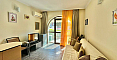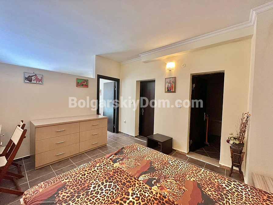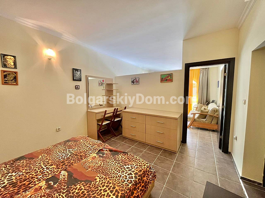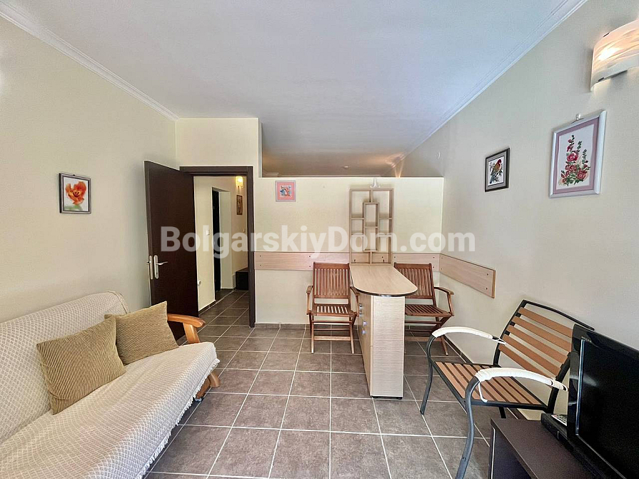 Wir präsentieren Ihnen ein außergewöhnliches und geräumiges Studio mit fester Raumtrennung im Komplex St. George Plaza – ein hervorragendes Angebot zu einem attraktiven Preis in Sveti Vlas. Dieses Apartment mit einer Fläche von 55 qm befindet sich in einem sich dynamisch entwickelnden Teil des Ferienortes und entspricht funktional einer Two-Bedroom-Wohnung, da der Schlafbereich durch eine massive Wand abgetrennt ist. Die Aufteilung umfasst ein sonniges Wohnzimmer, ein separates Schlafzimmer, ein Badezimmer mit WC, einen Hauswirtschaftsbereich sowie ein charmantes Bogenfenster, das dem Interieur besonderen Charakter verleiht. Eine Küchenzeile fehlt derzeit, jedoch ist die Wohnung vollständig möbliert und bezugsfertig.