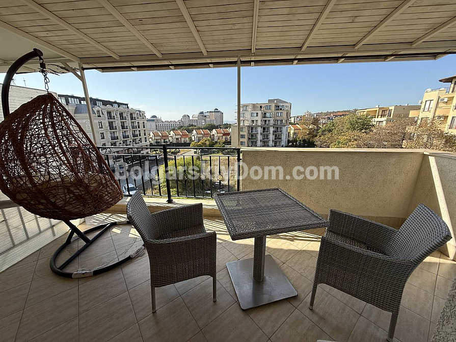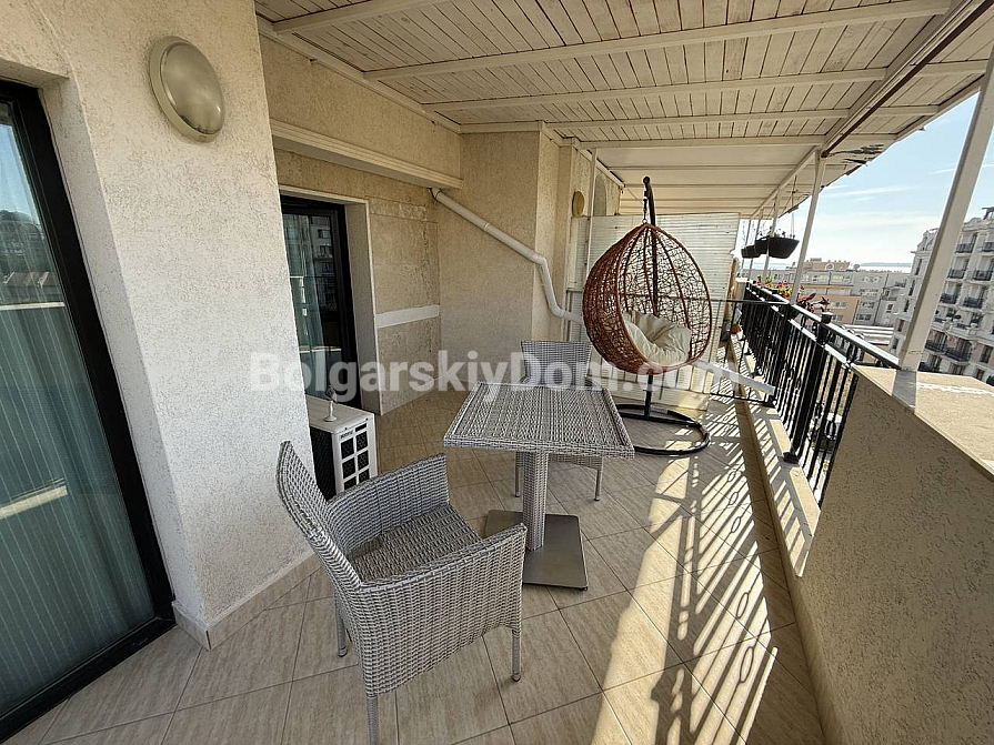 Neu auf dem Markt und das beste Angebot in Bezug auf Preis und Ausstattung in Sveti Vlas — eine sonnige Zweizimmerwohnung im South Bay Komplex, verkauft mit einem geschmackvoll geplanten Interieur! Diese geräumige Wohnung mit 76 m² befindet sich im 5. Stock eines modernen Gebäudes mit Aufzug. Die Wohnung ist komplett möbliert, und das Interieur ist mit großem Geschmack und Funktionalität gestaltet, sodass Sie keine Zeit oder Mühe für die Einrichtung aufwenden müssen. Viel Licht dank großer Fenster und angenehmer halbrunder Formen, die dem Raum einen besonderen Charme verleihen. Und natürlich gibt es eine gut gestaltete Terrasse, perfekt zum Entspannen (mit einem geschlossenen, ausfahrbaren Markisensystem).