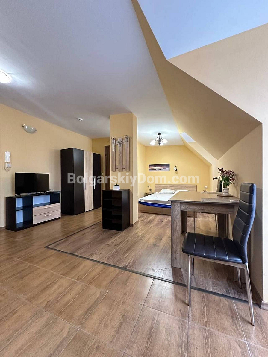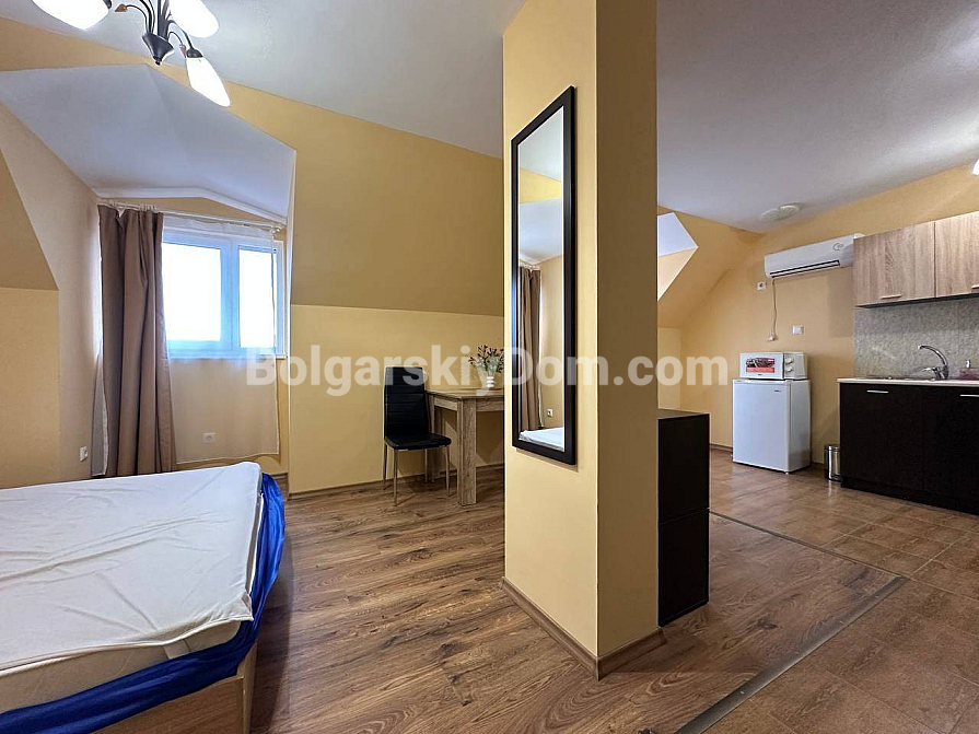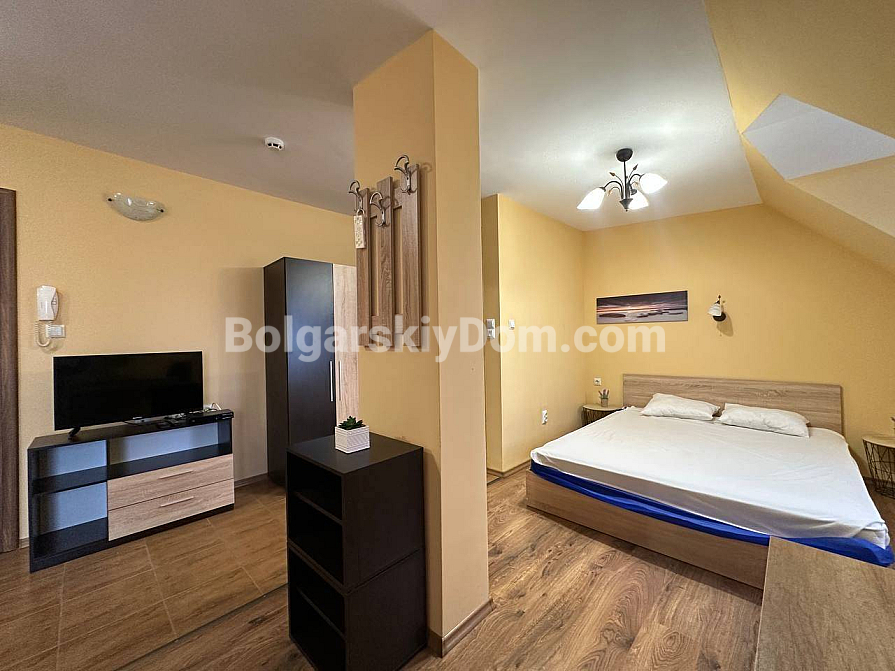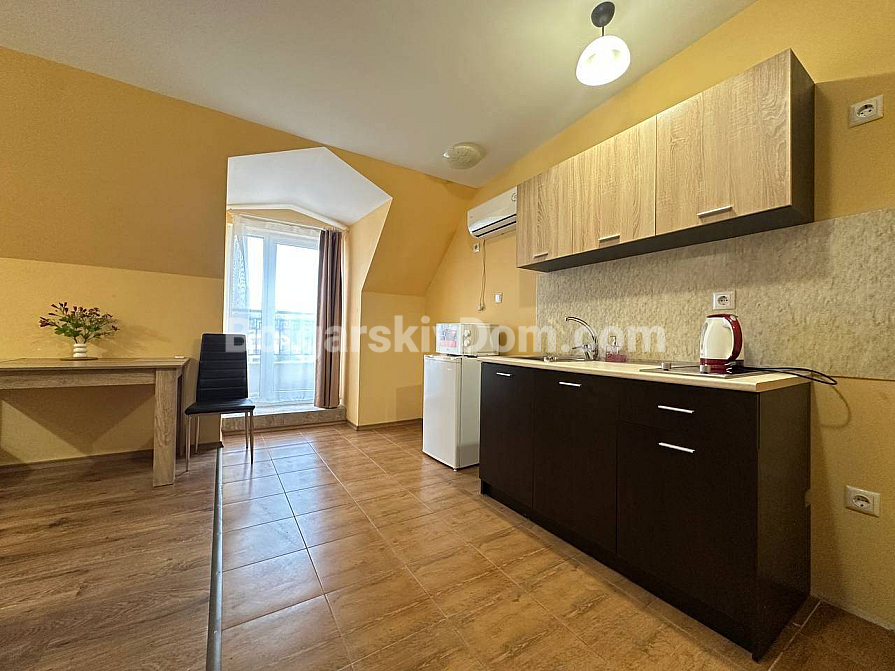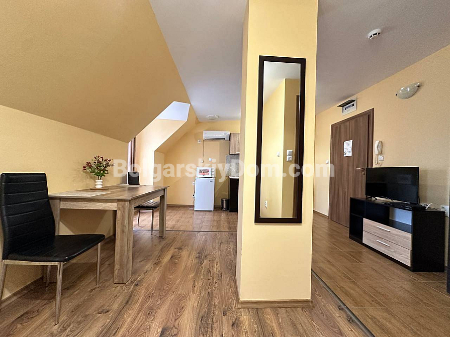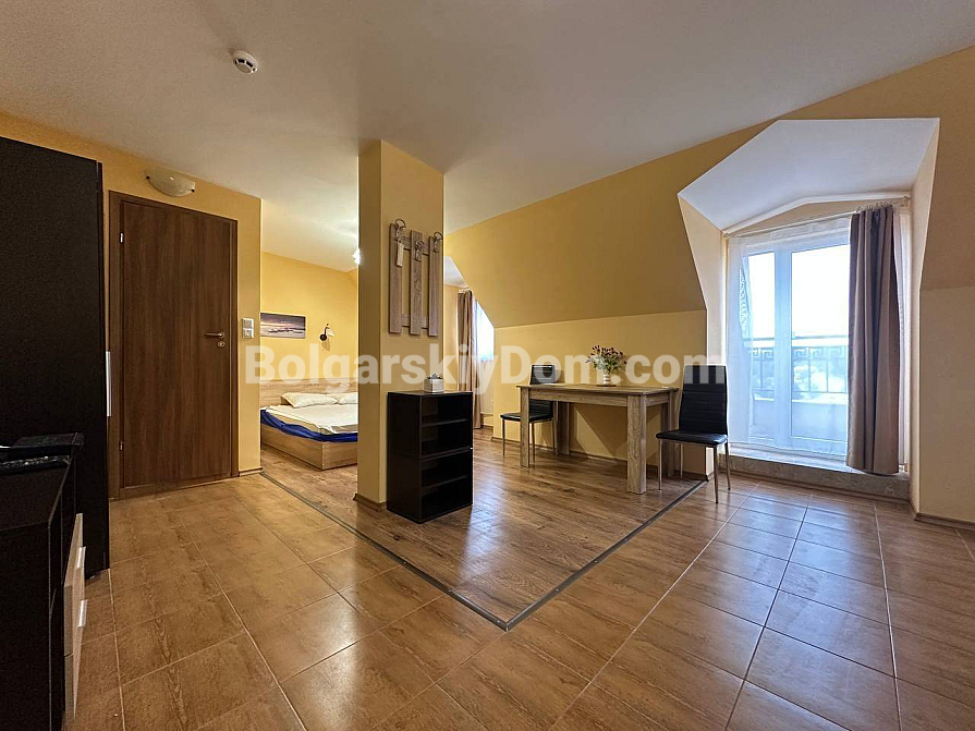 Helligkeit, Luft und Meerblick — ein Studio mit eigenem Charakter im Komplex Horizon, gelegen in einem ruhigen, grünen Viertel zwischen Sonnenstrand und Sveti Vlas. Dieses Apartment im obersten, fünften Stock ist nicht einfach Wohnfläche, sondern ein Raum mit Stimmung. Die 40 qm sind durchdacht gestaltet: der kreisförmige Grundriss vermittelt Leichtigkeit und fließende Bewegung. Rechts befindet sich eine praktische Küchenzeile. Links, in einer gemütlichen Nische hinter einer Säule, liegt der Schlafbereich — ein privater Rückzugsort. Dazwischen verbindet der Essbereich das gesamte Raumgefühl und macht es warm und wohnlich. Und hinter der Glastür — eine kleine Terrasse mit einem Ausblick, von dem man kaum wegsehen möchte: das Meer und der endlose Küstenstreifen.