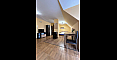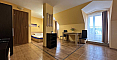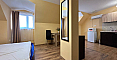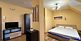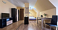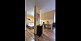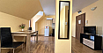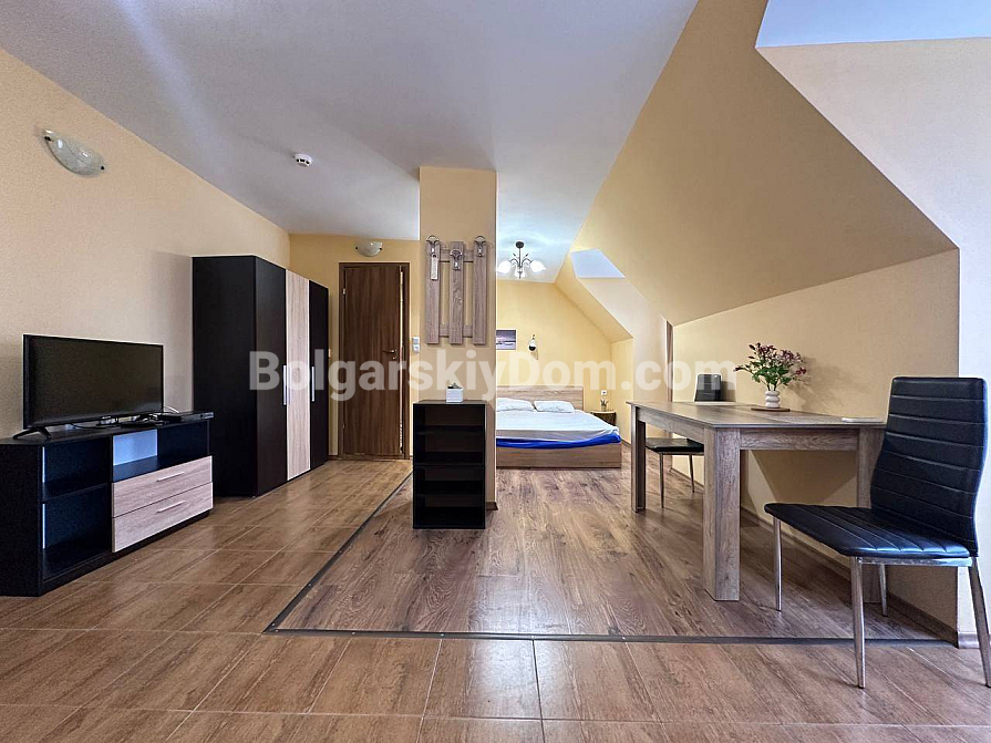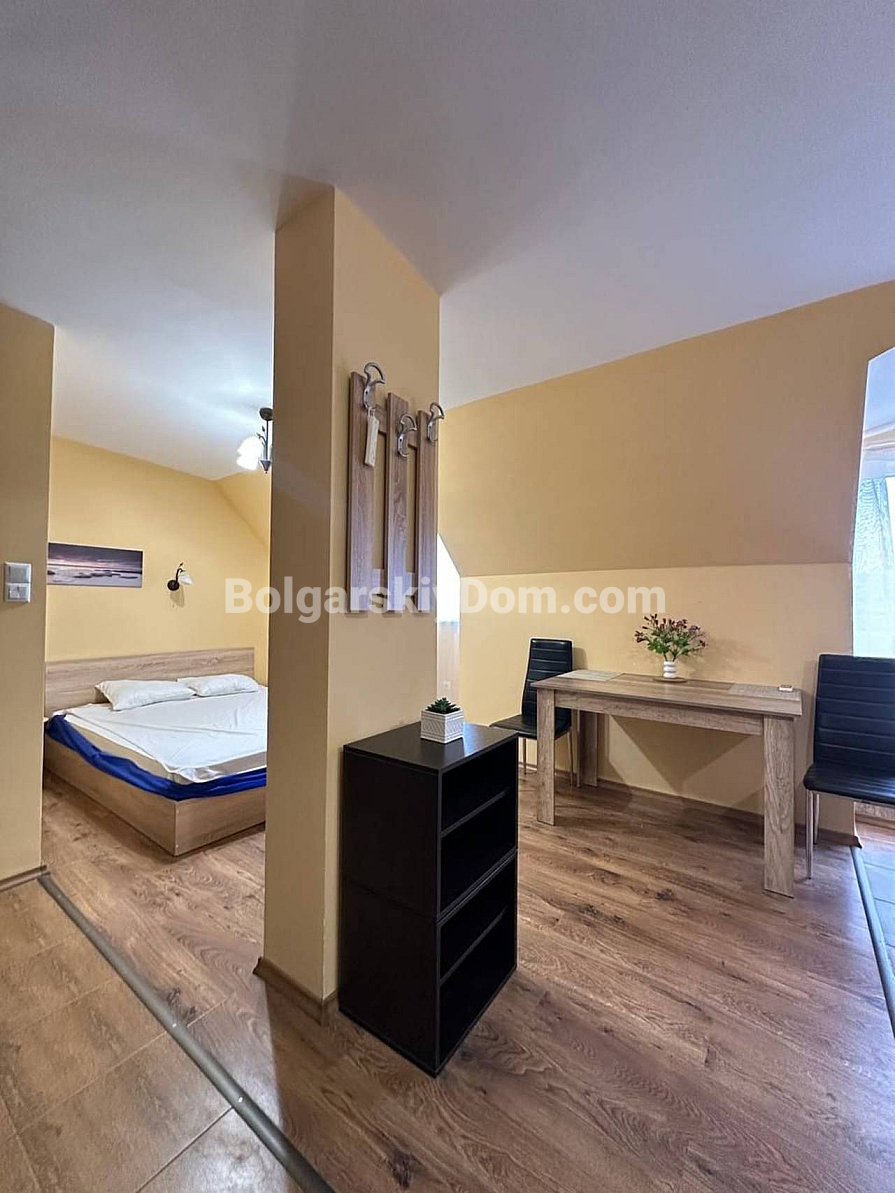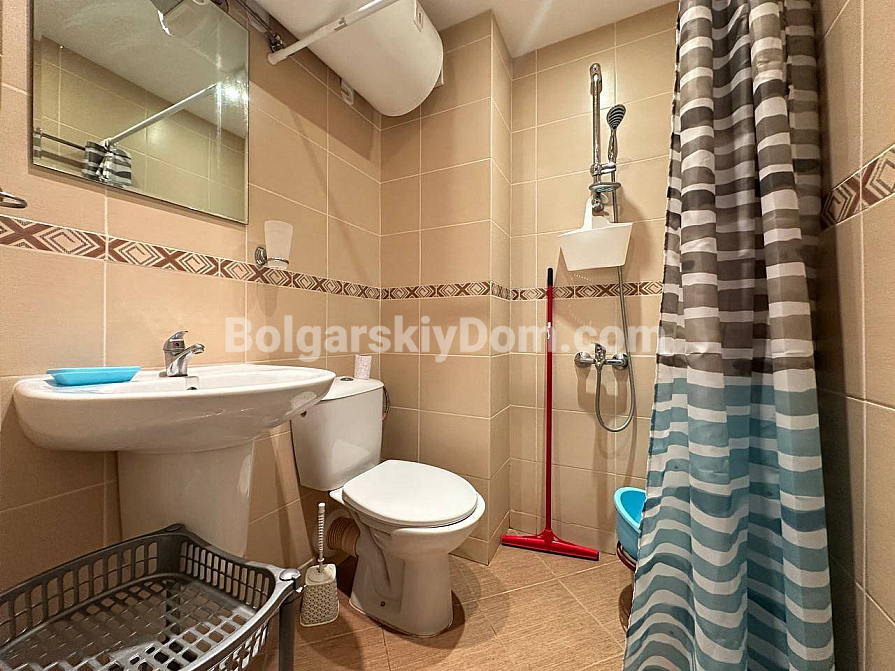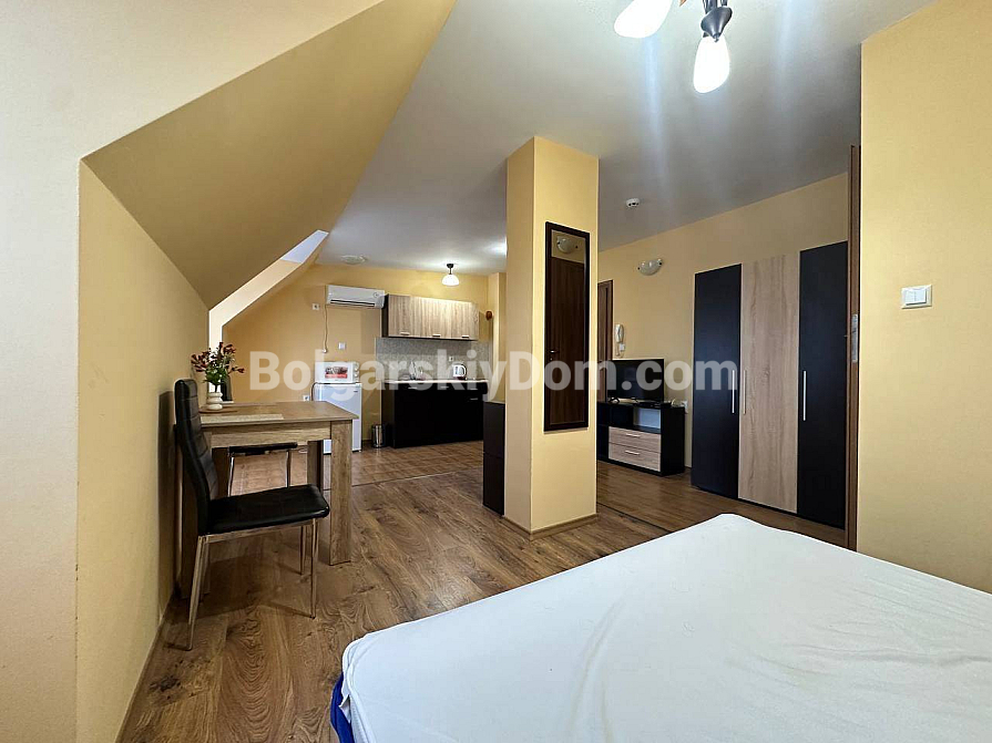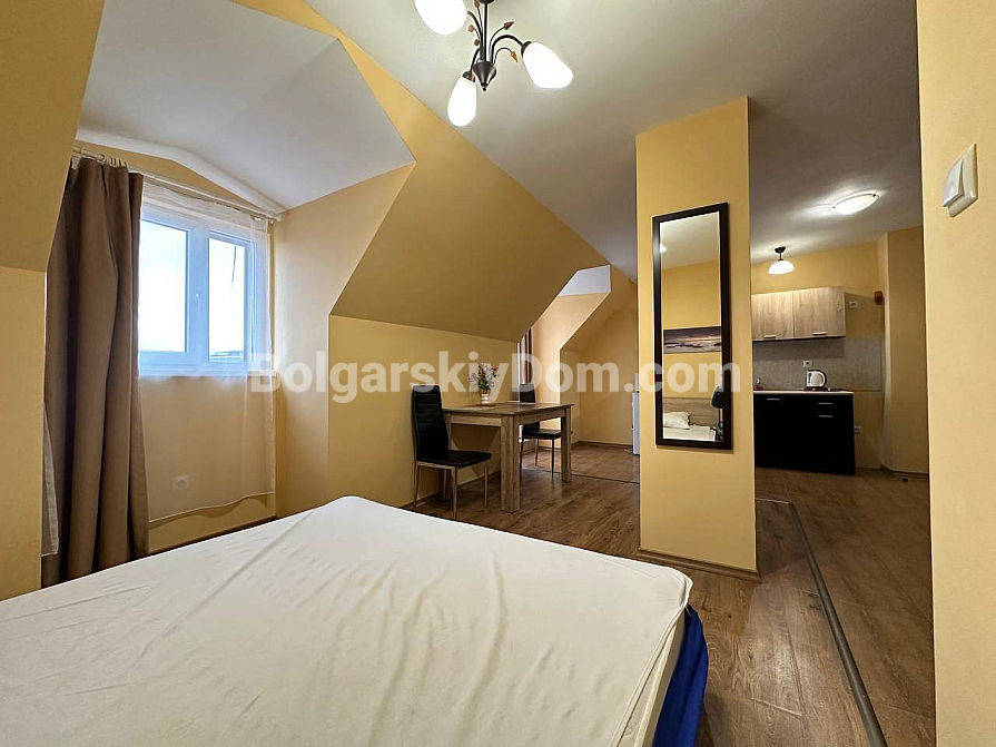 Helligkeit, Luft und Meerblick — ein Studio mit eigenem Charakter im Komplex Horizon, gelegen in einem ruhigen, grünen Viertel zwischen Sonnenstrand und Sveti Vlas. Dieses Apartment im obersten, fünften Stock ist nicht einfach Wohnfläche, sondern ein Raum mit Stimmung. Die 40 qm sind durchdacht gestaltet: der kreisförmige Grundriss vermittelt Leichtigkeit und fließende Bewegung. Rechts befindet sich eine praktische Küchenzeile. Links, in einer gemütlichen Nische hinter einer Säule, liegt der Schlafbereich — ein privater Rückzugsort. Dazwischen verbindet der Essbereich das gesamte Raumgefühl und macht es warm und wohnlich. Und hinter der Glastür — eine kleine Terrasse mit einem Ausblick, von dem man kaum wegsehen möchte: das Meer und der endlose Küstenstreifen.