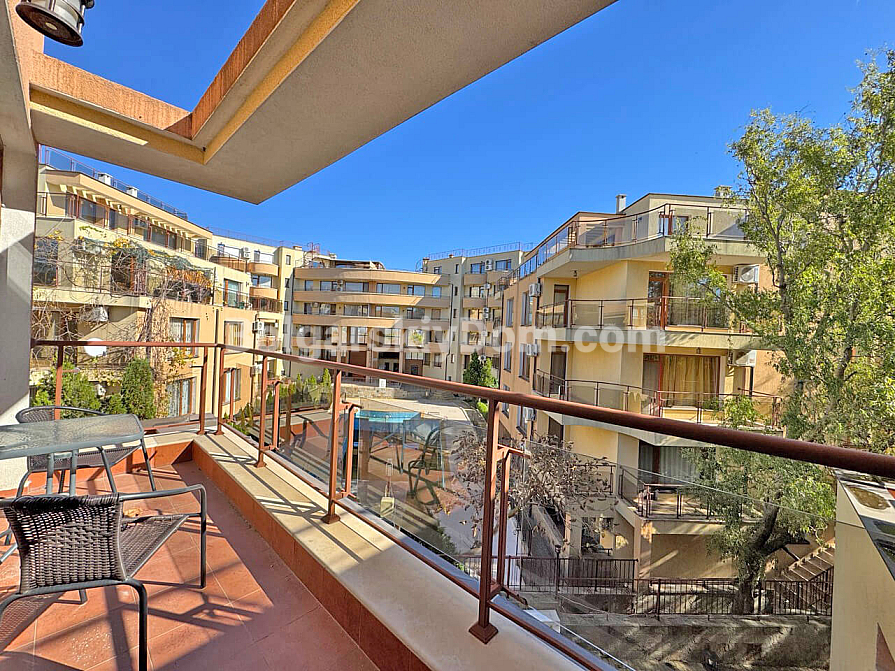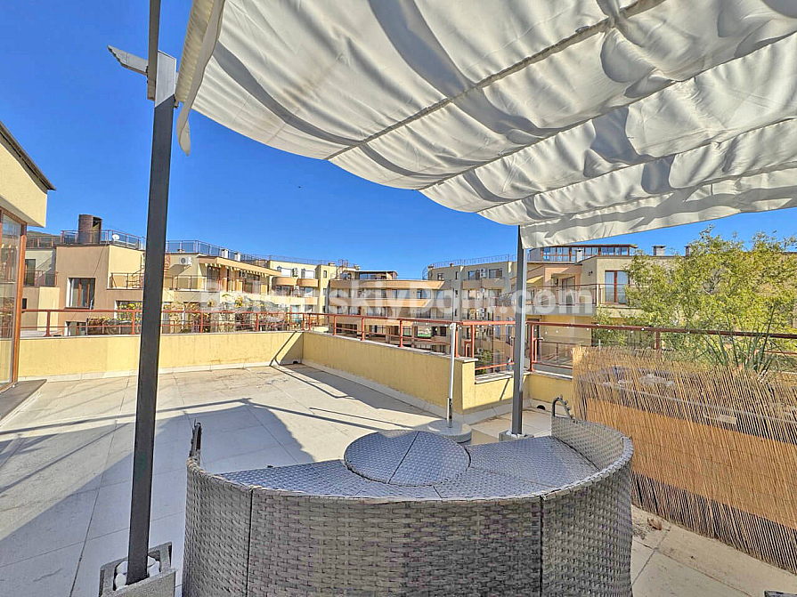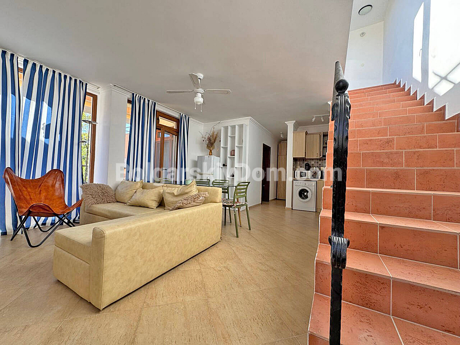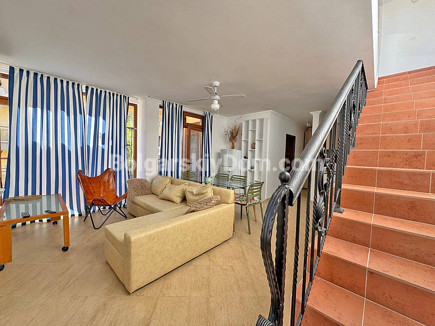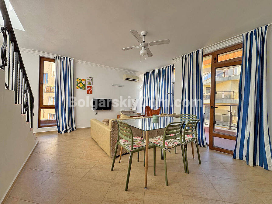 Wow-Format jetzt im Verkauf! In unserem Katalog ist ein wunderschönes Zweizimmer-Maisonette-Apartment mit 129 m² im Komplex Antonia im prestigeträchtigen Ferienort Sveti Vlas erschienen! Diese Wohnung erstreckt sich über zwei Ebenen (zweiter und dritter Stock) und bietet idealen Wohnraum für maximalen Komfort. Die Maisonette wird möbliert und mit Geräten verkauft – komplett bezugsfertig für das ganze Jahr, für den Sommerurlaub oder zur rentablen Vermietung. Die Raumaufteilung ist sehr funktional: im ersten Level befinden sich der Eingangsbereich, ein Badezimmer mit Dusche, ein geräumiges Wohnzimmer mit Küche und Essbereich sowie eine Terrasse. Über eine Treppe gelangt man in das zweite Level mit Schlafzimmer und einer weiteren Terrasse.