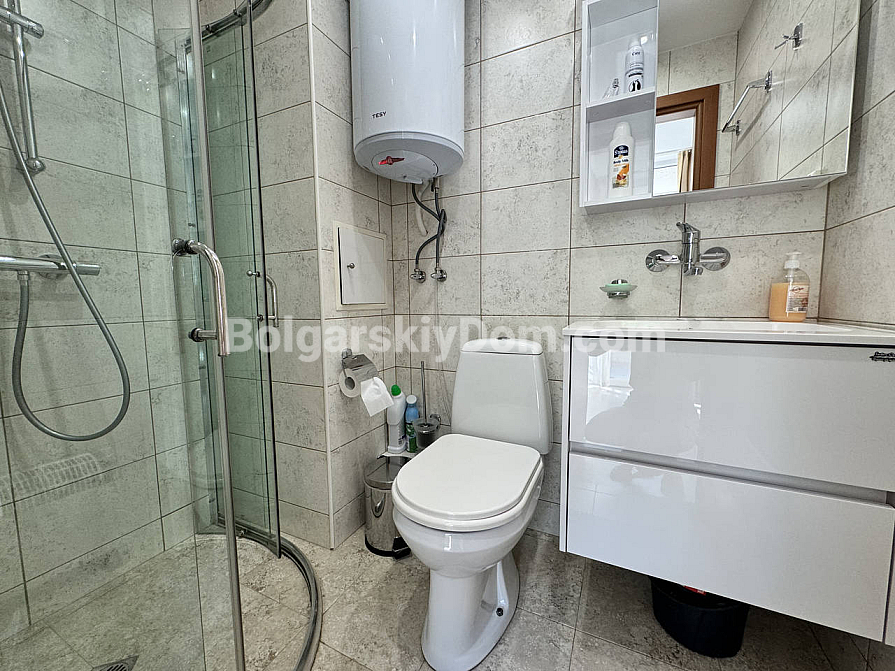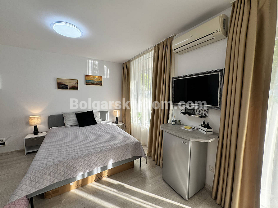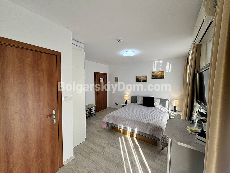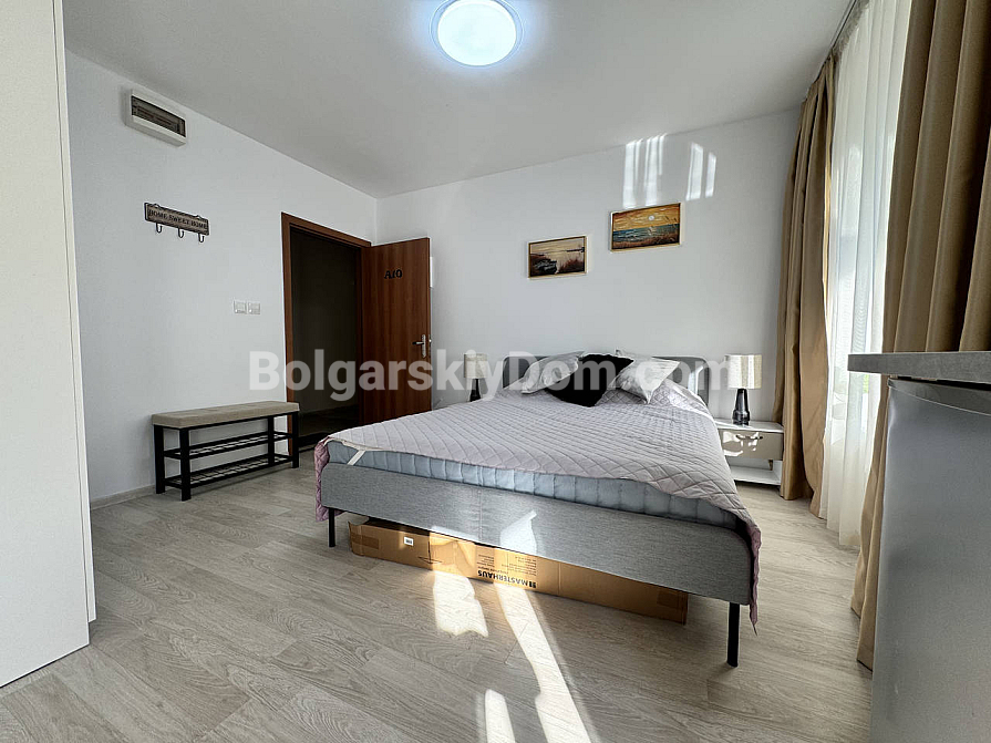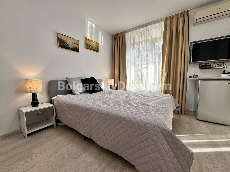 Neu im Segment der Top-Investitionen! Bolgarskiy Dom bietet ein helles und stilvolles Studio mit einer Fläche von 37 qm in Sonnenstrand, gelegen im Erdgeschoss der Anlage Dawn Park. Das Interieur ist im modernen minimalistischen Stil gestaltet, mit einer harmonischen Kombination aus Weiß- und Beigetönen, die ein Gefühl von Weite und Helligkeit schafft. Die Wohnung ist vollständig ausgestattet: eine komplette Küchenzeile mit praktischer Waschmaschine und komfortablen Schränken ist vorhanden. Der Schlafbereich verfügt über ein bequemes Doppelbett sowie einen Kleiderschrank. Ein besonderer Vorteil ist die großzügige, gemütliche möblierte Terrasse mit direktem Zugang zum grünen Innenhof der Anlage — der perfekte Ort für den Morgenkaffee.