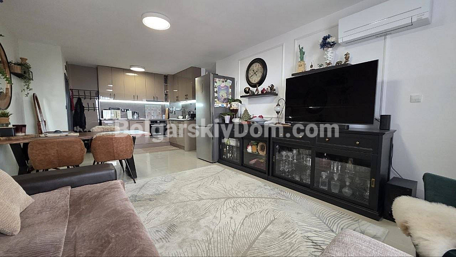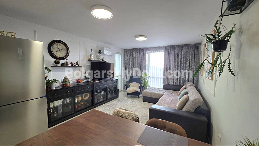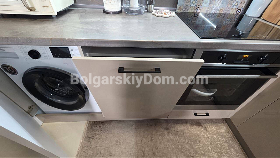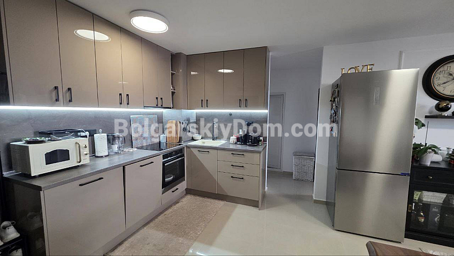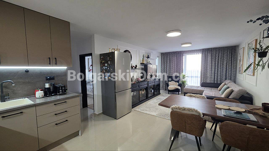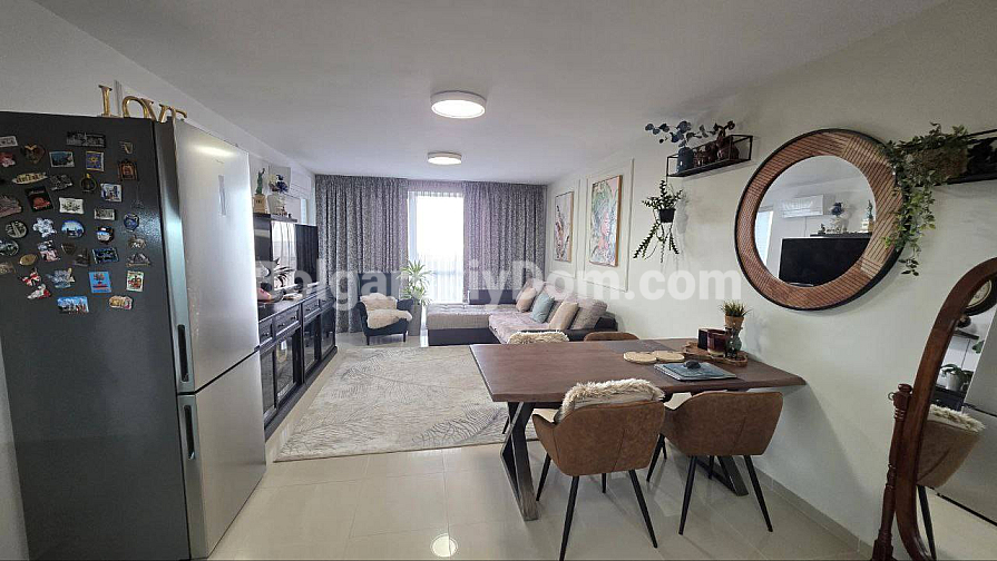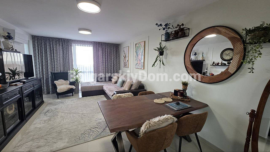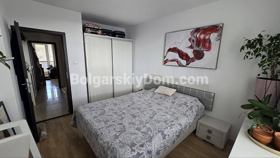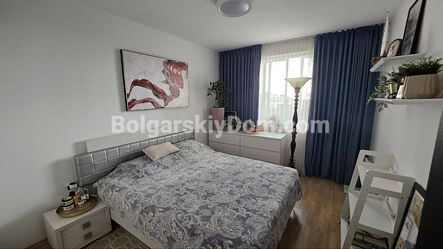 Eine hervorragende Lösung für ein Leben in Sveti Vlas mit Meerblick direkt aus den Fenstern! Die Spezialisten von Bolgarskiy Dom präsentieren ein großzügiges Drei-Zimmer-Apartment (zwei Schlafzimmer) im gepflegten Komplex Butterfly. Die Immobilie mit 93,3 qm befindet sich im 5. Stock und beeindruckt durch ihr Raumangebot: eines der Zimmer ist ein etwa 30 qm großes Wohnzimmer! Von der auf einer malerischen Anhöhe gelegenen Wohnung eröffnet sich ein wunderbares Panorama auf das Meer, Sonnenstrand und die Altstadt von Nessebar. Das Apartment wird mit moderner Renovierung, Möbeln und Geräten verkauft — komplett bezugsfertig.
