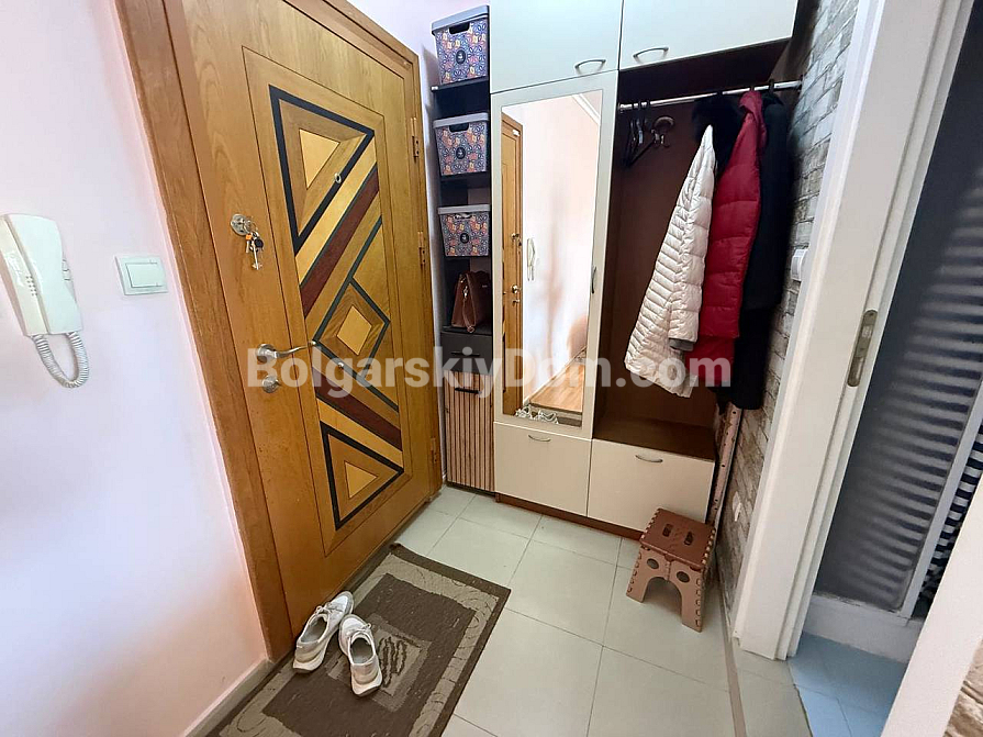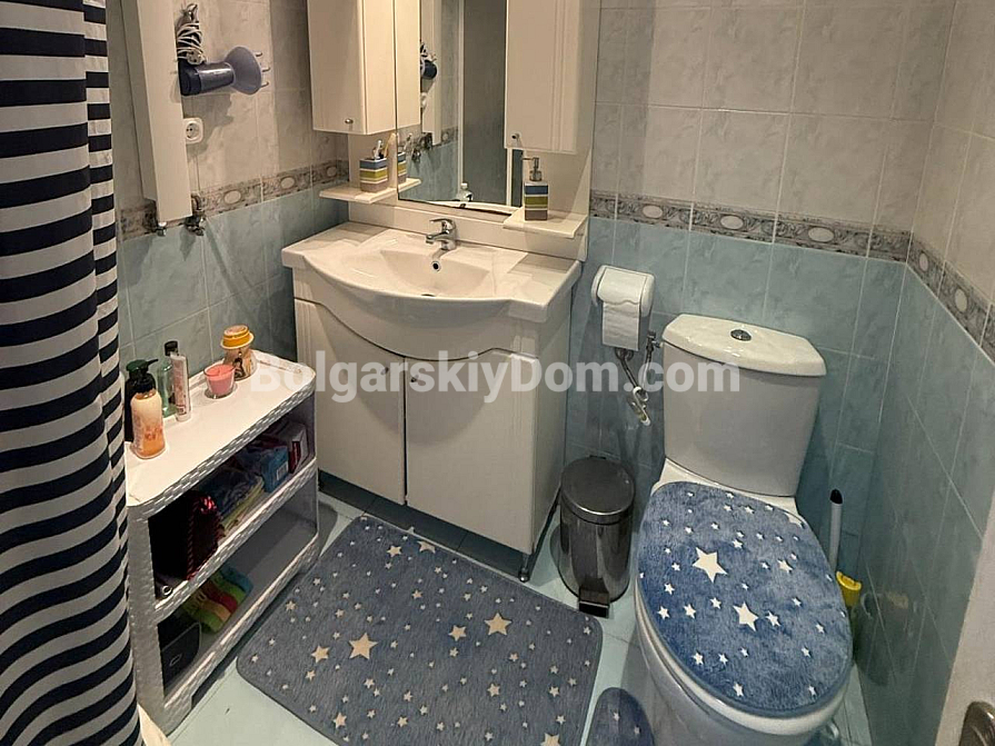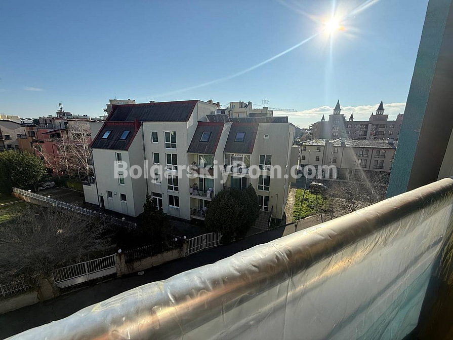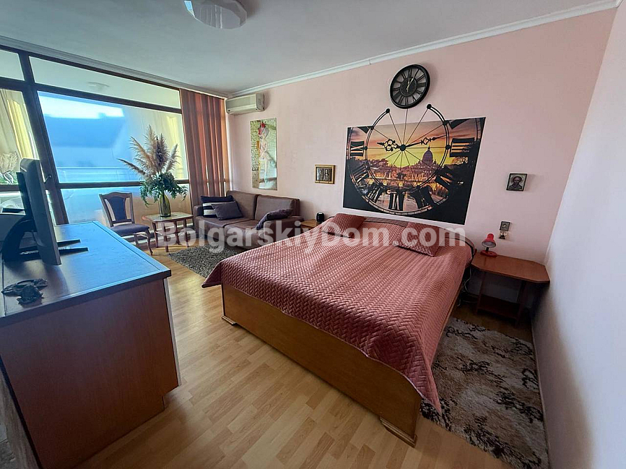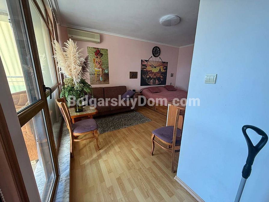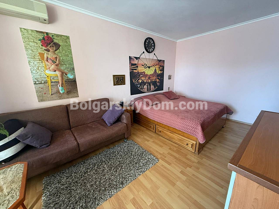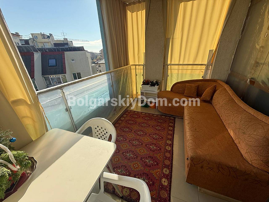 Das Team der Immobilienagentur Bolgarskiy Dom bietet ein exklusives Studio-Apartment mit Fokus auf Großzügigkeit im Komplex Sun City 1 in Sonnenstrand zum Kauf an. Mit einer Wohnfläche von 60 qm befindet sich diese Immobilie im vierten Stock und eignet sich ideal als Feriendomizil mit einem besonderen Highlight: einer beeindruckenden Terrasse mit Ecksofa und Gartenmöbeln, die als vollwertiger Außen-Wohnbereich genutzt wird. Das Studio ist vollständig möbliert, verfügt über einen separaten Küchenbereich, einen zonierten Wohnraum mit Bett und Sofa sowie eine komplette Ausstattung mit Haushaltsgeräten. Die Wartungsgebühr beträgt lediglich 8 Euro pro qm und Jahr.