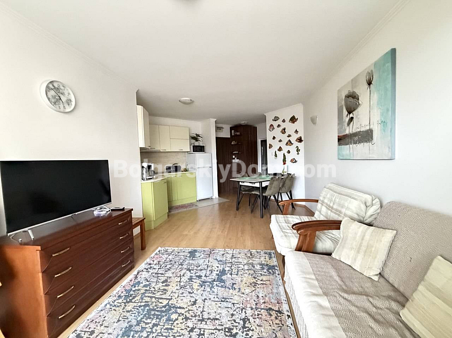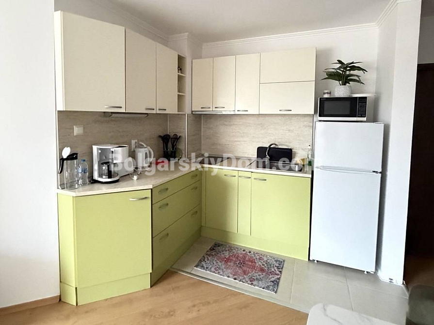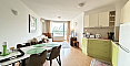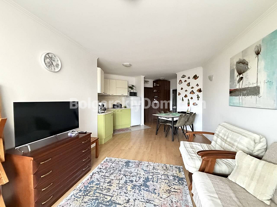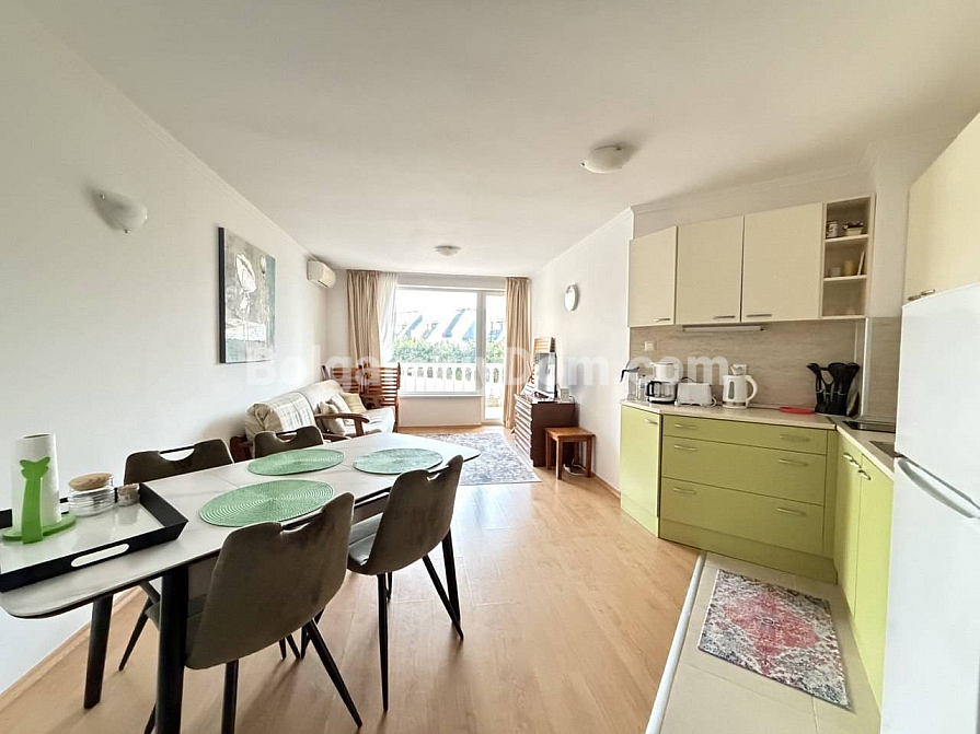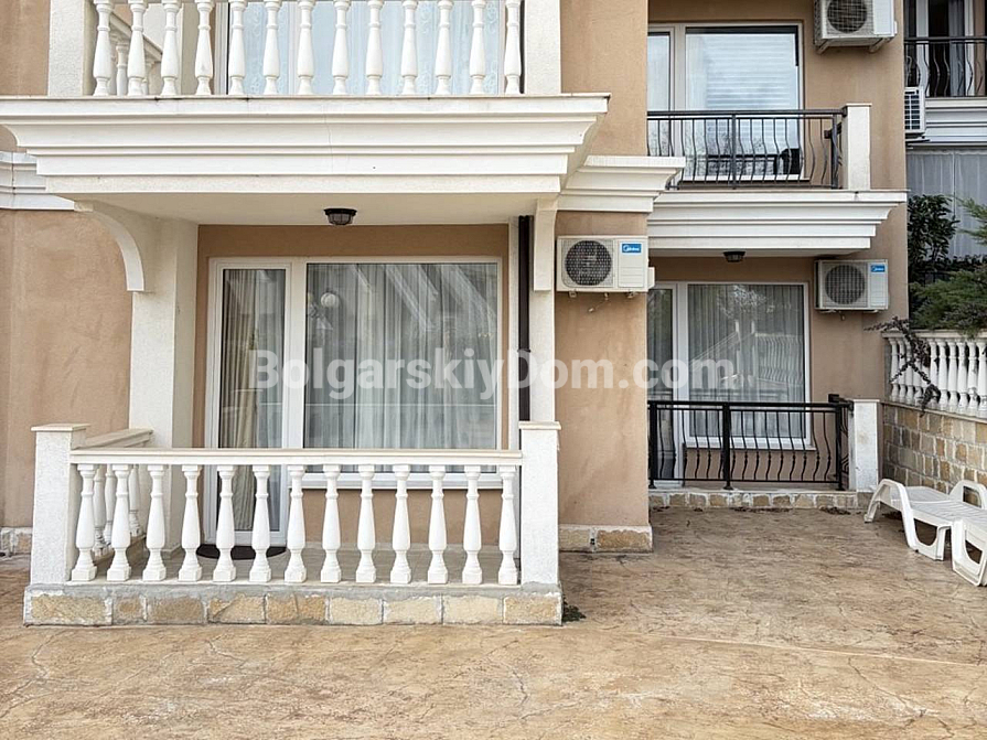 Luxusimmobilien von Bolgarskiy Dom. Wenn Sie ein Gleichgewicht zwischen Privatsphäre und erstklassigem Service suchen, sollten Sie dieses Objekt in der Villa Antorini in Betracht ziehen. Die Wohnung mit einer Fläche von 65 qm befindet sich im zweiten Stock und richtet sich an alle, die Gemütlichkeit schätzen: Die Fenster bieten einen Blick auf den gepflegten Innenhofgarten und vermitteln das Gefühl einer privaten grünen Oase. Der Grundriss umfasst ein großzügiges Wohnzimmer, ein separates Schlafzimmer sowie zwei Terrassen, die eine durchdachte Aufteilung der Außenbereiche ermöglichen. Das Meer ist nur 200 Meter entfernt, und der berühmte Yachthafen Marina Dinevi ist in etwa 15 Gehminuten erreichbar.