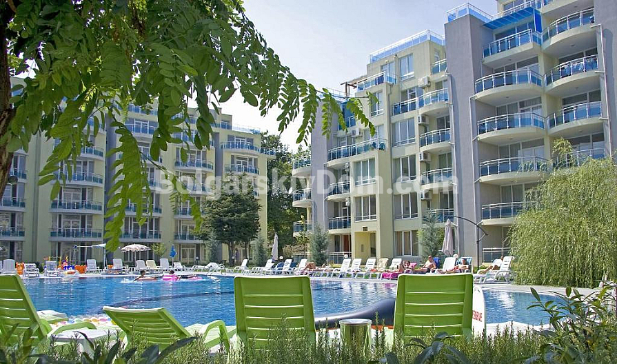 Der geschlossene Wohnkomplex befindet sich in erster Reihe, nur 50 Meter vom Strand entfernt. Das Gelände ist gesichert, mit Zugangskontrolle und Aufzug. Zur Ausstattung gehören ein großer Swimmingpool und ein Außenfitnessbereich. Die Lage in Ravda garantiert Ruhe und keinen starken Touristenverkehr, während Geschäfte, Apotheken und Restaurants fußläufig erreichbar sind.