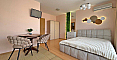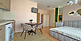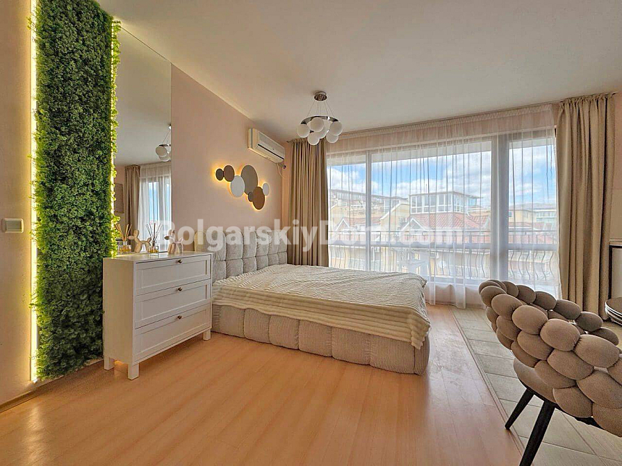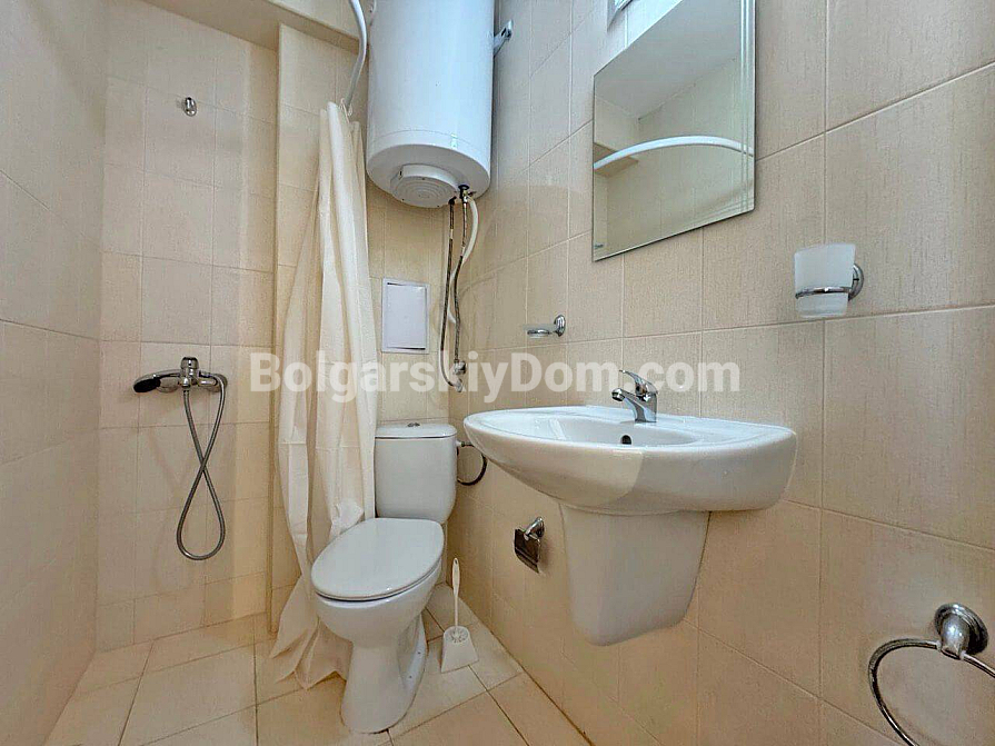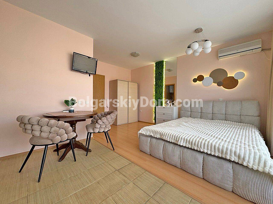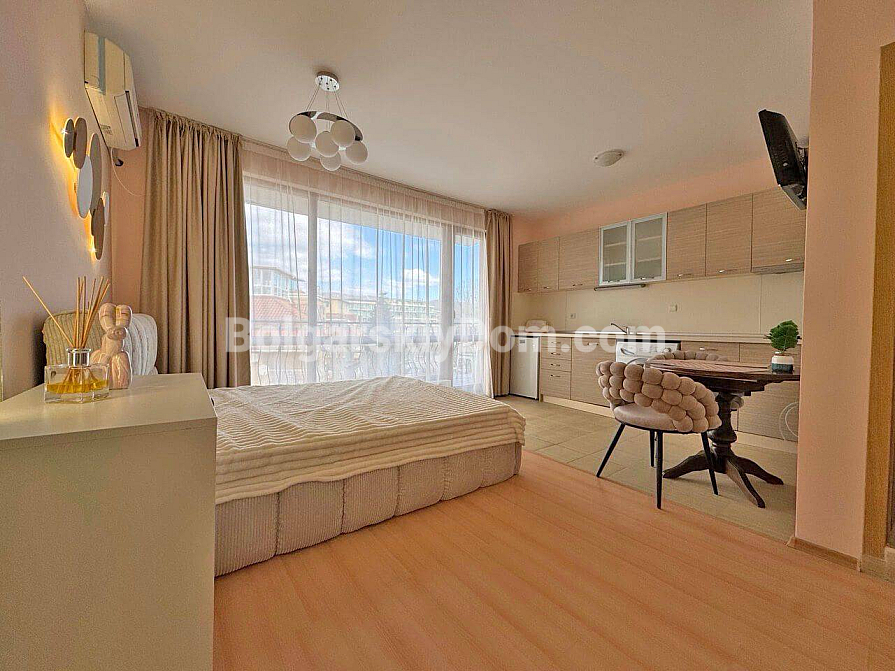 Ein stilvolles und rentables Angebot von Bolgarskiy Dom! Modernes Studio im beliebten Komplex Diamond Bay im Zentrum von Sonnenstrand. Die Wohnung befindet sich im 4. Stock eines sechsstöckigen Gebäudes mit Aufzug, Gesamtfläche 40 m², mit offenem Grundriss: ein geräumiger Raum mit harmonisch kombinierter Küchenzone (mit Herd, Kühlschrank und Schränken), einem großen Doppelbett und einer Sitzecke, ein modernes Badezimmer mit Dusche sowie ein geräumiger Balkon zum Entspannen mit Blick auf die Anlage. Das Studio befindet sich in ausgezeichnetem Zustand: eine frische, ansprechende Renovierung, stilvolle hochwertige Möbel sowie alle notwendigen Elektro- und Haushaltsgeräte sind vorhanden – einziehen und sofort wohnen ohne zusätzliche Arbeiten!